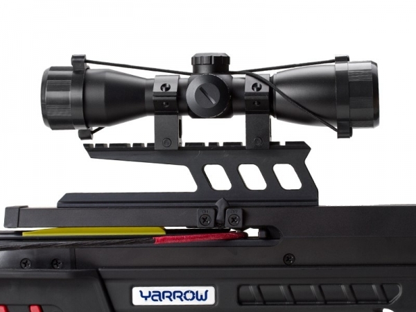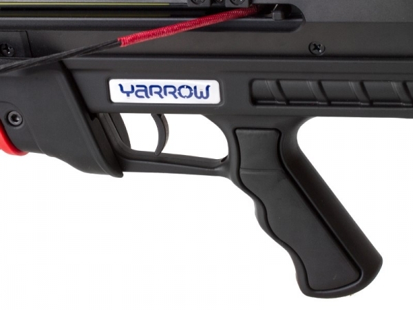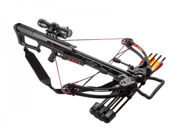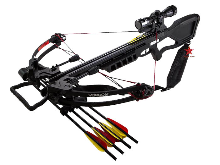 Арбалет Yarrow Model T: Блочный арбалет винтовочного типа имеет в конструкции блоки-эксцентрики, которые обеспечивают более легкий, по сравнению с рекурсивными арбалетами, взвод тетивы. Прицельная дальность стрельбы 30-40 метров. Сила натяжения не превышает 43 кг, поэтому для приобретения, ношения и использования не требуются разрешения, достаточно иметь при себе только сертификат ЭКЦ МВД РФ. Копию сертификата Вы получите при покупке товара в нашем магазине. В комплекте с арбалетом поставляются оптический прицел 4х32, кивер, 4 стрелы, наплечный ремень, ручной натяжитель. В продаже имеются запасные части: законцовки, тетива, стрелы, дуга (плечи). Наличие уточняйте у менеджера.