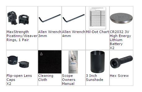 - Кольца для крепления на планку Weaver, антибликовая бленда длиной 6,4 см и откидные колпачки в комплекте с прицелом.