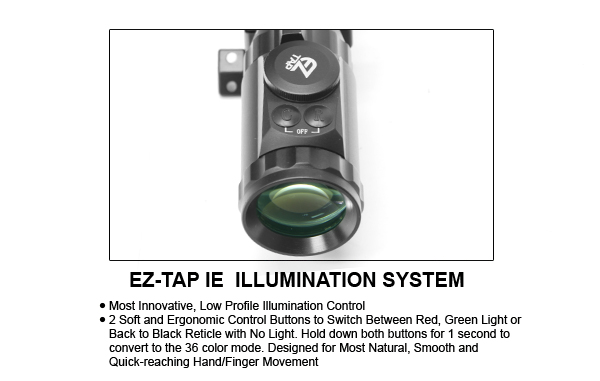 - Динамичный дизайн корпуса прицела с боковым барабаном, регулирующим яркость красной/зеленой подсветки.