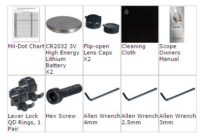 Кнопки служат для переключения между красной и зеленой подсветкой (или выключением подсветки вообще, в таком случае используется обычная черная сетка). При нажатии обеих кнопок на 1 сек, происходит переход к режиму 36-ти оттенков подсветки. Защита от солнца «Козырек» объектива специально удлинен, для защиты от попадания лишнего света солнца, дождя и т.п. Выгравированная прицельная сетка Mil-Dot Сегодня это одна из самых популярных тактических сеток в мире. Широкое поле зрения и четкое изображение по всей площади линзы гарантируют быстрое прицеливание даже на периферии изображения. Тактическая сетка Мил-Дот имеет 9 точек во всех направлениях от центра, что позволит Вам точно прицелиться. Заполнение азотом Полость внутри прицела наполнена азотом для предотвращения возможного запотевания в различных климатических условиях. Внутренний механизм Все детали прицела изготовлены машинным способом, что гарантируют четкую и плавную работу внутреннего механизма, цикличность и стабильность результата при постоянном использовании. Быстро-откидные накладки на оптику В комплект включена 1 пара резиновых накладок на оптику. Крышечки надежно защищают оптику от грязи, влаги и удобно снимаются, обеспечивая быстрый переход из походного положения оптики в рабочее. Крепление Прицел поставляется с низкими кольцами на планку Picatinny/Weaver (Пикатинни/Вивер) с рычажным прижимом. Если прицел не нужен в данный момент – его можно легко «откинуть» в сторону не снимая. Испытания качества Все прицелы Leapers проходят жесткие испытания на ударные нагрузки в двух разных направлениях и на устойчивость к вибрации. Использование Благодаря легендарной технологии True Strength, прицел легко устанавливается на тяжелую отдачу и совместим с нарезным оружием распространенных калибров и мощнейшей пружинно-поршневой пневматикой. Технические характеристики: