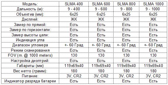 Лазерный дальномер SLMA 600 - функциональный и компактный оптический прибор. Позволяет измерять расстояния от 10 до 600 метров. Дальномер SLMA с точностью до 1 метра покажет вам прямое расстояние до цели, высоту цели, расстояние до цели вдоль линии горизонта(горизонталь), а так же угол, под которым производится измерение. Все эти данные отображаются на дисплее одновременно, что экономит время и позволяет стрелку быстрее ввести поправку и сделать единственно верный выстрел. Для сложных условий измерения и для исключения естественного тремора рук предусмотрен режим сканирования - дальномер непрерывно сканирует дистанцию и выводит полученные показания на дисплей. 6-ти кратное оптическое увеличение и многослойное покрытие линз дают четкое и контрастное изображение. Дальномер может отображать дистанцию как в метрах, так и в ярдах. Благодаря новому микропроцессору измерения стали еще быстрее и точнее. Дальномером очень легко пользоваться - вам нужна всего одна кнопка. По окончании использования дальномер отключается через 20 сек. самостоятельно, до следующего использования. Ресурс батарейки - более 3000 измерений. Дальномер поставляется в полностью работоспособном комплекте: дальномер, инструкция на русском языке и гарантийный талон, батарейка CR2, защитный чехол, ремешок для ношения на плече. Гарантия составляет 1 год. Для Екатеринбурга: