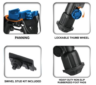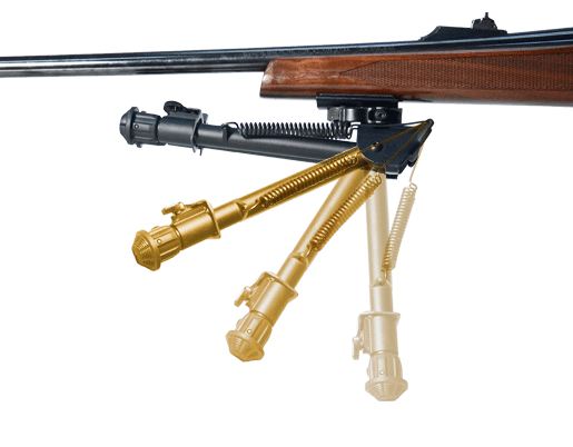 • Ножки (опоры) с прочными возвратными пружинами быстро и легко складываются. Они оснащены наконечниками из мягкого пластика. Это дает стрелку дополнительные преимущества при стрельбе с твердых поверхностей.