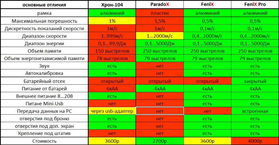 Хронограф рамочный "FeniX" - это усовершенствованная версия широкоизвестного Хрон-104. Предназначен для измерения скорости пули пневматического оружия. Прибор оптический, фиксирует любое тело (будь то свинец, сталь или пластик), прошедшее внутри трубы прибора. Дискретность измерения 0,1м/с, скорость 0.4...2000м/с, энергия 0,1...5000Дж, масса пули 0,01...99,9г, номер выстрела, возможность удаления (всех замеров, неудачных замеров, единичного замера), временная память 250 выстрелов, энергонезависимая память 79 выстрелов, средняя скорость, средняя энергия, измерение скорострельности 50…9999выстр./мин (скорость всех выстрелов сохраняются в памяти), программное переключение воздух/со2, звуковой сигнал при простое, возможность ручной и автоматической калибровки, настройка чувствительности датчиков. Рамка металлическая, имеется крепление под штатив. Максимально возможная погрешность 0,5% Сразу три варианта питания: 4 батареи АА (пальчиковые), внешнее питание 8..20В (штекер с проводом в комплекте), разъем mini-USB (питание от PC или Power Bank). Габариты: 165х77х83мм (ДхШхВ). Рамка 60х60мм (стенка 2мм). Комплект включает в себя: - прибор, руководство пользователя, штекер с проводками для подключения внешнего питания. Батарейки в комплект не входят! Дополнительно к хронографу вы можете приобрести (укажите товар в доп. информации при оформлении заказа):