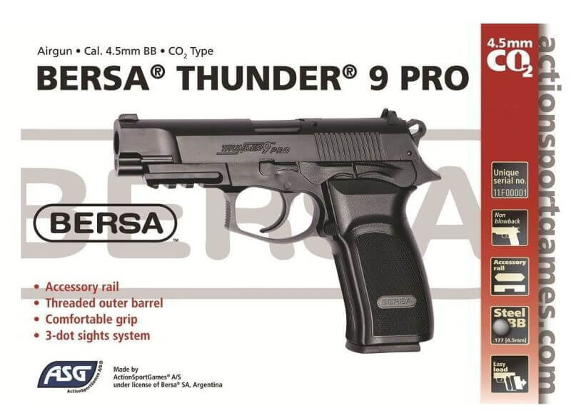 Пневматический пистолет ASG Bersa Thunder 9 Pro - газобаллонный пневматический пистолет, аналог боевого пистолета Bersa Thunder 9 Pro (Аргентина) Начальная скорость боеприпаса составляет 130 м/с, что достаточно много для такого вида пневматики.