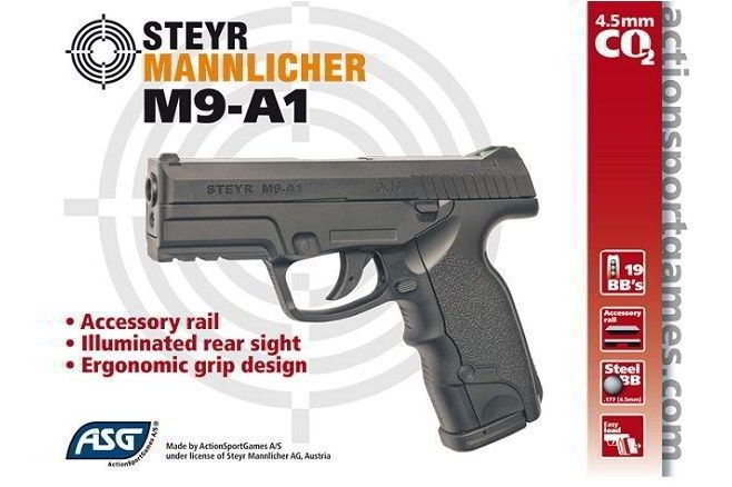 Пневматический пистолет ASG Steyr Mannlicher M9 A1 - это довольно качественная пневматическая копия популярного пистолета Steyr Mannlicher от австрийской фирмы. Пистолет ASG Mannlicher стреляет самовзводом. Начальная скорость пули при этом составляет от 114 до 137 м/с.