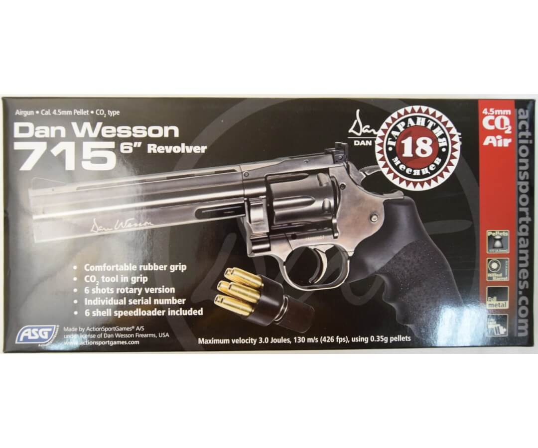 Главная → Купить по низкой цене → Пневматические пистолеты → ASG (Дания) → Пневматический револьвер ASG Dan Wesson 715-6 steel grey пулевой