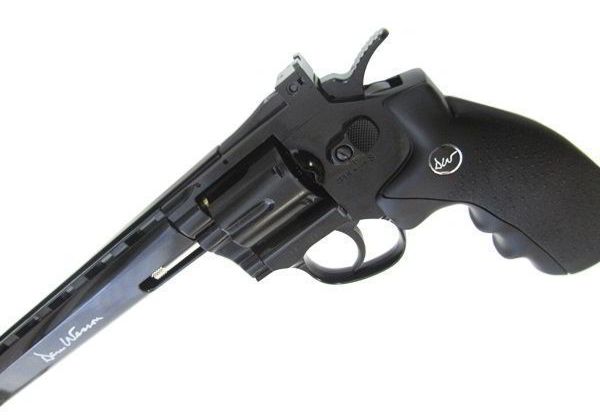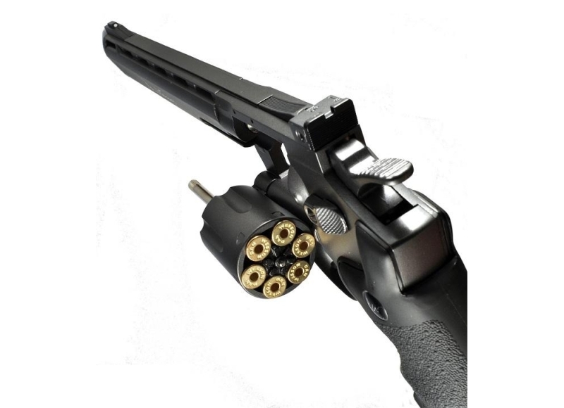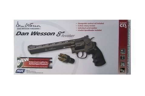 Пневматический револьвер ASG Dan Wesson 8 пулевой с восьмидюймовым стволом- точная цельнометаллическая копия боевого американского револьвера Dan Wesson с блестящим серебристым покрытием, эргономичной рукояткой из прочного АБС-пластика. Пневматический аналог производится датской компанией ASG. Револьвер несет аутентичную маркировку и имеет выбитый на раме уникальный серийный номер. Баллон CO2 размещается в рукоятке.