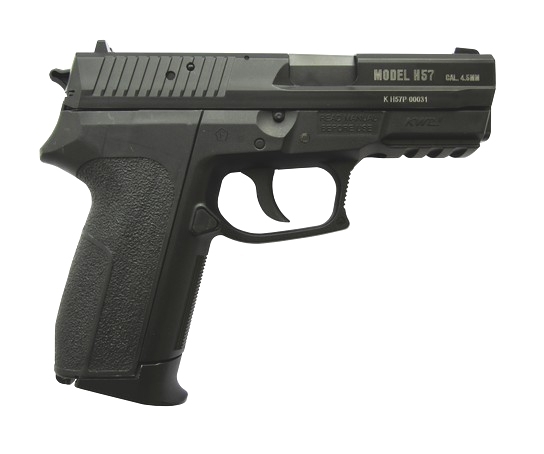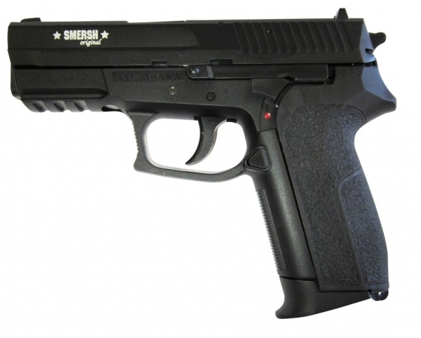 Smersh H 57 - качественная реплика одной из последних моделей знаменитого пистолета Sig-Sauer. Данный пневматический газобаллонный пистолет имеет металлические затвор и магазин. Рамка этого пистолета выполнена из ударопрочного пластика. Модель Smersh H 57 оснащена ударно-спусковым механизмом только двойного действия, что позволяет стрелять ничего не взводя, сразу после помещения магазина в рукоятку. Рычаг, выполняющий на огнестрельном прототипе роль сброса взвода курка, на пневматической копии приспособлен под предохранитель, и при переводе его в нижнее положение, тяга спускового крючка размыкается с курком. У Smersh H 57 есть планка Вивера для крепления аксессуаров, например, лазерного целеуказателя или тактического фонаря. Для Екатеринбурга: