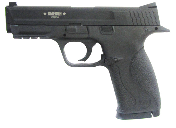 Удобный в эксплуатации, надежный и доступный по цене газобаллонный пистолет Smersh H58 является полным аналогом знаменитого SW MP. Обладая прицельной дальностью в 10 метров при начальной скорости заряда в 100 м/с, он отлично подойдет как опытным стрелкам для развития своих профессиональных способностей, так и новичкам, послужив инструментом к познанию азов обращения с оружием. Эргономичный каркас Smersh H58, выполняется из металла и ультрапрочного пластика. Надежная система автоматического взведения курка и относительно небольшой вес (700 гр.) превращают стрельбу в комфортный процесс, от которого каждый стрелок получит удовольствие. Оснащен пистолет металлической обоймой, вмещающей 19 стальных шариков калибра 4,5 мм и баллончиком, заполненным углекислым газом, массой в 12 гр. Стрельба производится посредством вытеснения заряда через ствол, потоком СО2 при высоком давлении. Энергия пули для Smersh H58 достигает 3 Дж, что является достаточно серьезным показателем в данной оружейной категории. Для Екатеринбурга: