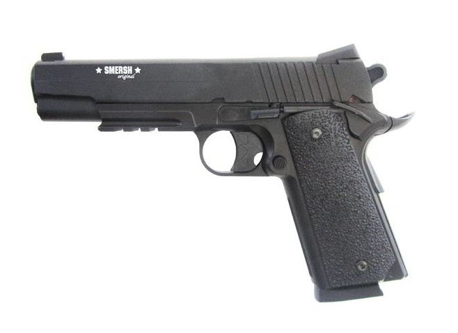 Представляем своим клиентам качественную копию Colt 1911, которая реализуется под маркой Smersh - данная торговая марка довольно известна на рынке пневматики, и пистолет Smersh H60 является одной из удачнейших вариаций данного легендарного оружия. Smersh H60 - это недорогой, точный и мощный и газобаллонный пистолет с полноценным неподвижным затвором. Эта модель прекрасно подойдет и для начинающего стрелка, и для опытного эирганнера. Модель достоверно копирует боевой Sig Sauer GSR, который является развитием знаменитого пистолета Кольт 1911. Smersh H60 стреляет исключительно самовзводом. Есть предохранитель, подпружиненный фальшкурок, который не играет никакой роли в стрельбе, но двигается после нажатия на спусковой крючок. Эта модель не является точной репликой классического Кольта 1911, производитель немного видоизменил некоторые элементы дизайна, отчего пневматическая копия лишь выиграла. Smersh H60 приобрел гораздо более современные, даже чуть спортивные контуры, при этом не теряя своей узнаваемой формы. Эта пневматика соответствует представлениям сегодняшних стрелков о том, каким же должно быть оружие. Компания-производитель позаботился о высоком качестве изготовления, а также о всех стрелковых характеристиках, которые соответствуют назначению пистолета полностью. Модель сделана полностью из металла и не просто имитирует внешний вид огнестрельного прототипа, но и прекрасно справляется с поражением любых мишеней. Пневматический пистолет от Smersh подходит и начинающим стрелкам, и более опытным. Для Екатеринбурга: