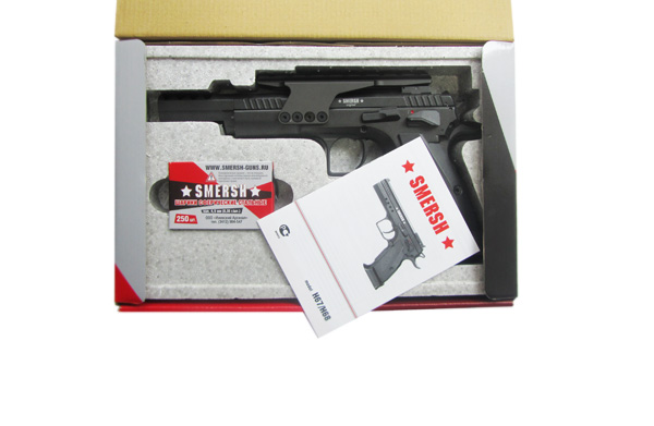 Пневматический пистолет Smersh H68 - это аналог спортивного оружия типа IPSC - Tanfoglio. Рассматриваемая модель в точности повторяет оригинал и по различным техническим параметрам, и по дизайну. Н68 обладает компактным двухсторонним предохранителем, который имеет регулировку целика по горизонтали и вертикали, а также оборудован крупным магвелом (специальное расширение канала для обоймы в самом основании рукояти). Это техническое расширение напоминает воронку, образованную для полноценной оперативной замены магазина почти на ходу. Модель Smersh H68 сделана полностью из металла, характеризуется наличием довольно мощного Blowback. Ударно-спусковой механизм этой пневматики - одинарного действия. Для самого первого выстрела необходимо передернуть затвор или же взвести курок. Н68 не оснащен штатными прицельными устройствами. Он ориентирован на стрельбу с дополнительными прицелами. В частности, с оптическими, коллиматорными, лазерными и оптико-электронными прицельными устройствами. Для Екатеринбурга:
