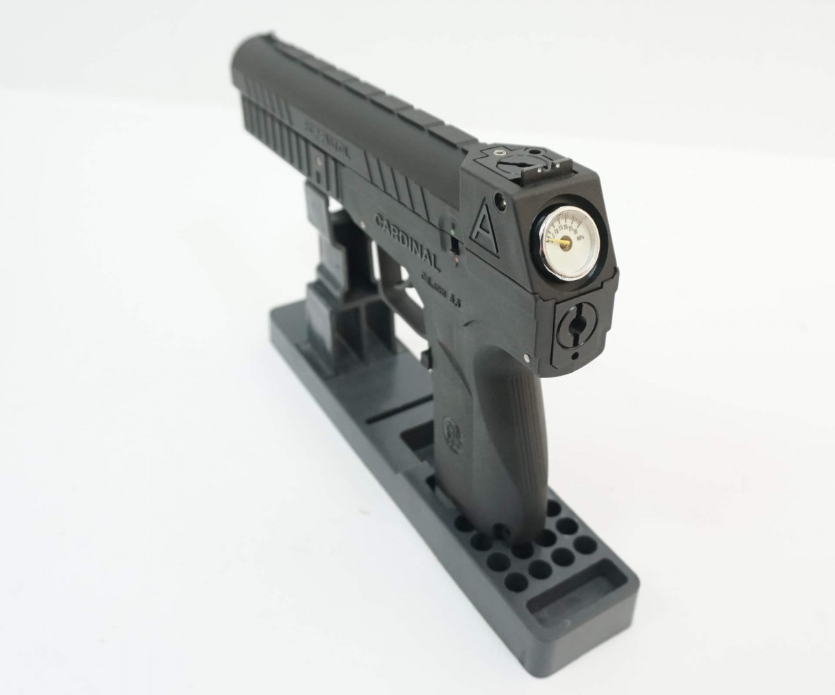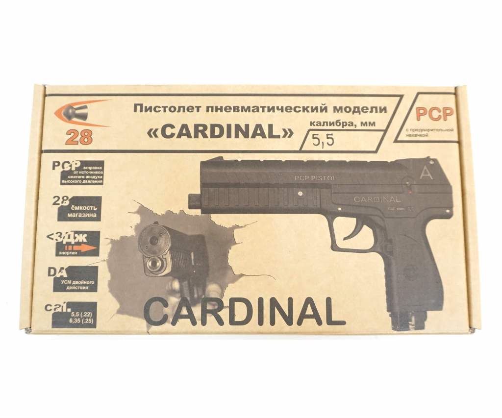 Пневматический пистолет Cardinal (PCP, УСМ двойного действия) 5,5 мм – это интересная модель вооружения с предварительной накачкой, многозарядная модификация от известного отечественного производителя. Энергию выстрела здесь обеспечивает сжатый воздух из резервуара высокого давления объемом 96 куб. см. Присутствует манометр для контроля уровня давления в резервуаре. Магазин пистолета конверторного типа, заряжается пулями из свинца для пневматики в количестве 28 единиц. Затвор пистолета Cardinal неподвижный. Скорость выстрела – 90 м/с. Стрельба возможна двумя способами: самовзводом и предвзводом. УСМ двойного действия. Установлен предохранитель в виде переключателя, он неавтоматического типа. Кнопка сброса магазина у этого пистолета дублируется с двух сторон. Нарезной ствол повышает точность выстрела. Такой пистолет продается без ограничений, за исключением возраста до 18 лет, так как поставляется ослабленным до мощности менее 3 Дж. Ствол и основание пистолета Cardinal выполнены из металла, корпус – из качественного полимерного материала. Пистолет увесистый, приятно лежит в руке. Установлена направляющая «ласточкин хвост» для оптики. Штатные прицельные устройства – нерегулируемые мушка и целик. Пистолет стреляет исключительно в полуавтоматическом режиме. Вес изделия 1 кг, длина 28 см. Поставляется в широкой комплектации – с ремкомплектом, двумя шестигранниками и винтовым ключом, заправочным штуцером, магазином, паспортом. Cardinal – солидный, мощный и надежный пистолет, изделие высокого качества сборки для тренировок в стрельбе. Для Екатеринбурга: