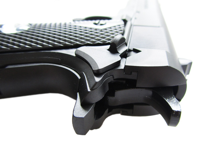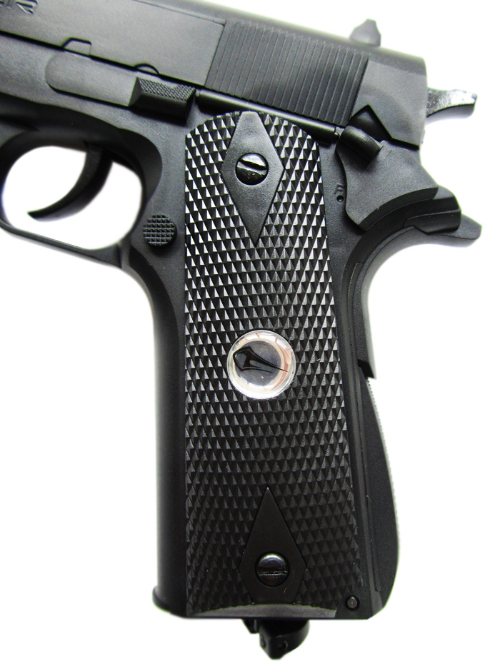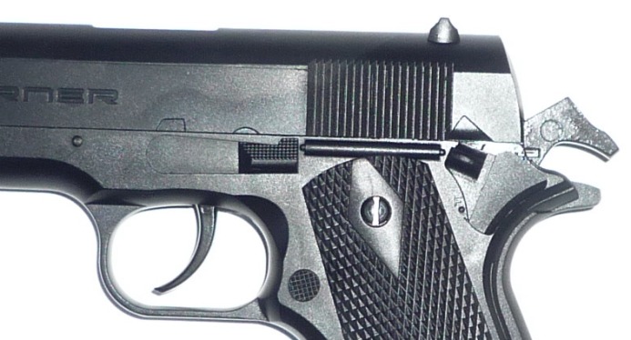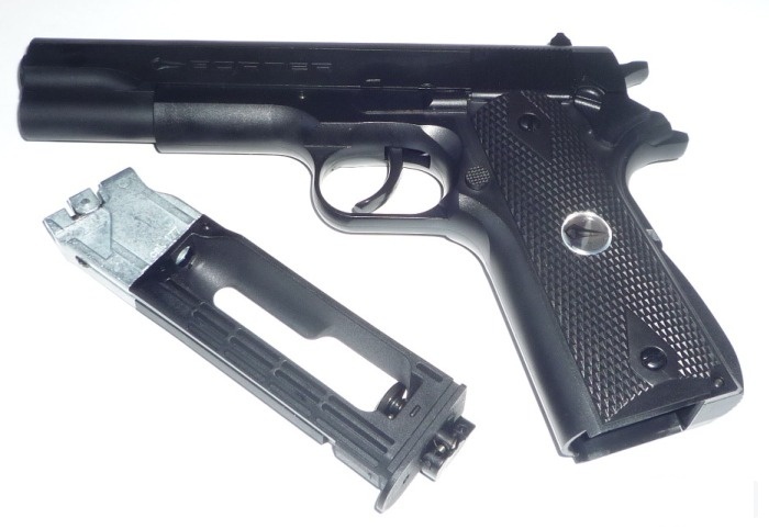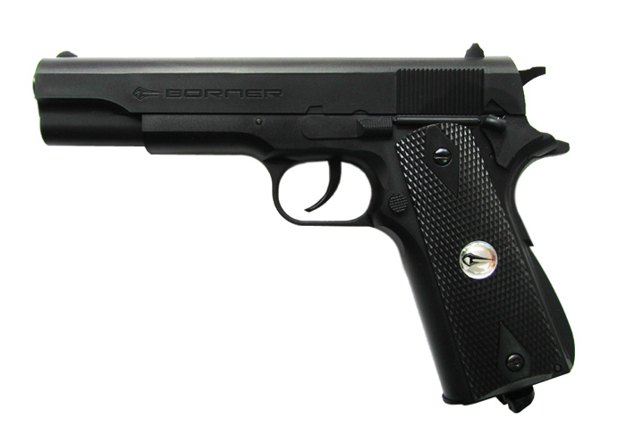 Borner CLT125 – это бюджетная копия пистолета Colt 1911. Имеется возможность стрельбы с предварительным взводом курка и самовзводом. Пистолет изготовлен из пластика и имеет габариты и внешние данные пистолета Colt 1911. Предохранитель у пистолета действующий. Поскольку затвор неподвижный, рычаг затворной задержки просто пластиковая имитация на рамке. У пистолета взводится курок, поэтому можно стрелять с предварительного взвода. Рукоятка пистолета Borner CLT125 как у классического варианта Кольта. Накладки на рукоятку несъемные, сделаны из пластика черного цвета, и имеют в середине вставку с логотипом Borner, в виде стилизованной летящей пули. Модель Borner CLT125 имеет полноразмерный магазин, в котором интегрирована обойма для шариков, отсек для баллона и клапанный механизм. В магазин уменьшается 20 стальных шариков. Одного баллончика, хватает на 7-8 магазинов. В среднем получается 150 выстрелов с баллона. На всех этапах стрельбы, мощность оказывается достаточной для стрельбы на рекомендуемой для короткоствольной пневматики дистанции – 10 метров. Для Екатеринбурга: