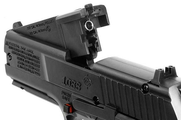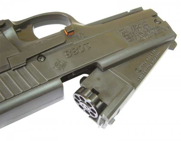 Пневматический пистолет Crosman 1088 BG в отличие от большинства пневматических газобаллонных пистолетов имеет нарезной ствол, позволяющий при сравнительно небольших габаритах придавать заряду очень неплохую начальную скорость. Кроме этого, полуавтоматический пистолет Crosman 1088 BG оснащен специальным механизмом, позволяющий регулировать прицел для достижения максимальной точности стрельбы. Однако самой большой особенностью пневматического пистолетаCrosman 1088 BG без сомнения является принципиально новый магнитный клип-барабан, позволяющий стрелять как стандартными омедненными шариками типа BB, так и свинцовыми пулями. Дизайн пневматического пистолета Crosman 1088 BG выдержан в классическом стиле, а удобная рифленая рукоять очень удобно лежит в ладони, позволяя полностью сосредоточиться на процессе стрельбы. Страна-производитель: Тайвань Для Екатеринбурга: