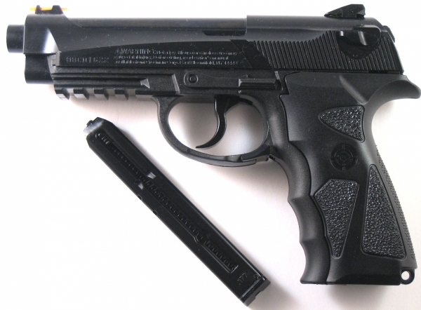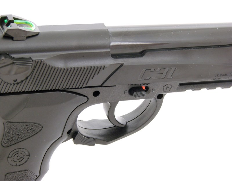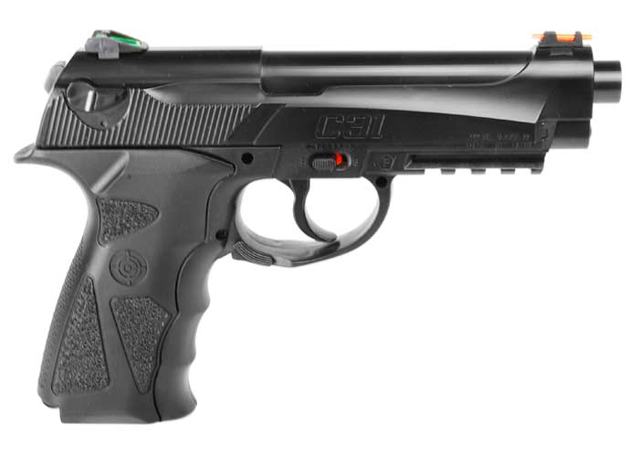 Лёгкий, удобный и мощный пневматический пистолет Crosman C31 сделан "под Беретту". Схема "подвижного ствола" обеспечивает надежность подачи шариков и минимизирует утечку газа при выстреле за счет отсутствия зазоров при ударе ствола по клапану. Именно за счет этого достигается высокая начальная скорость шарика и большое количество выстрелов с одного баллона. Пистолет имеет направляющую для установки аксессуаров (фонаря, лазерного целеуказателя и т.п.) Волокно-оптическая система прицеливания с регулируемой по горизонтали прицельной планкой. Пистолет имеет неавтоматический предохранитель. В комплект входит поясная кобура из синтетического материала. Корпус пистолета изготовлен из высококачественного пластика. Ствол – стальной, гладкий. Обойма выполнена из металла. Страна-производитель: Тайвань Для Екатеринбурга: