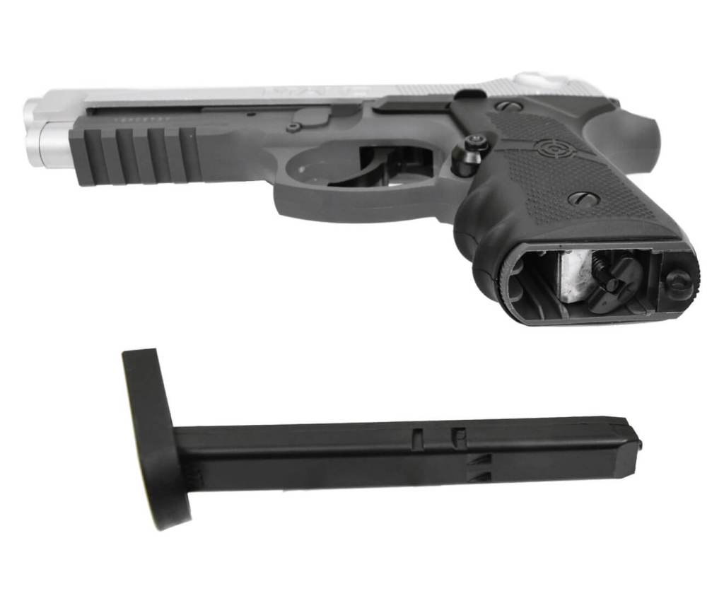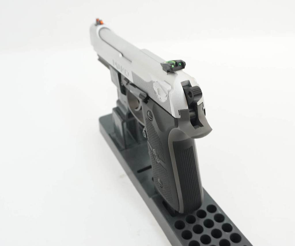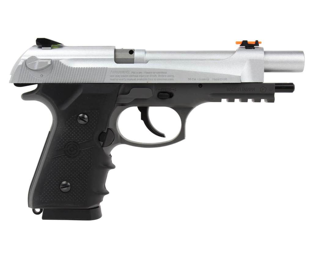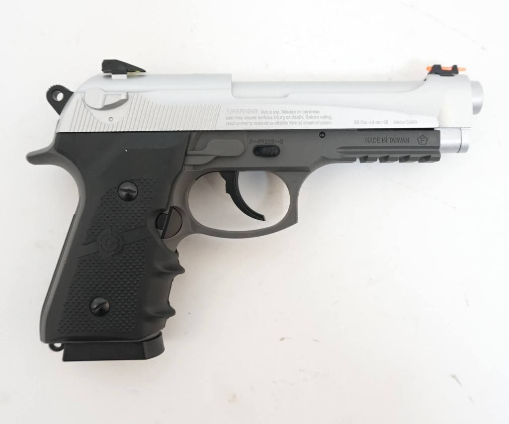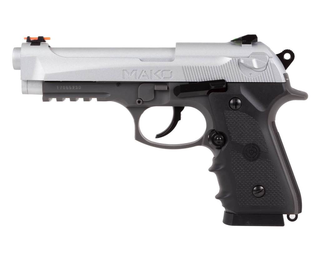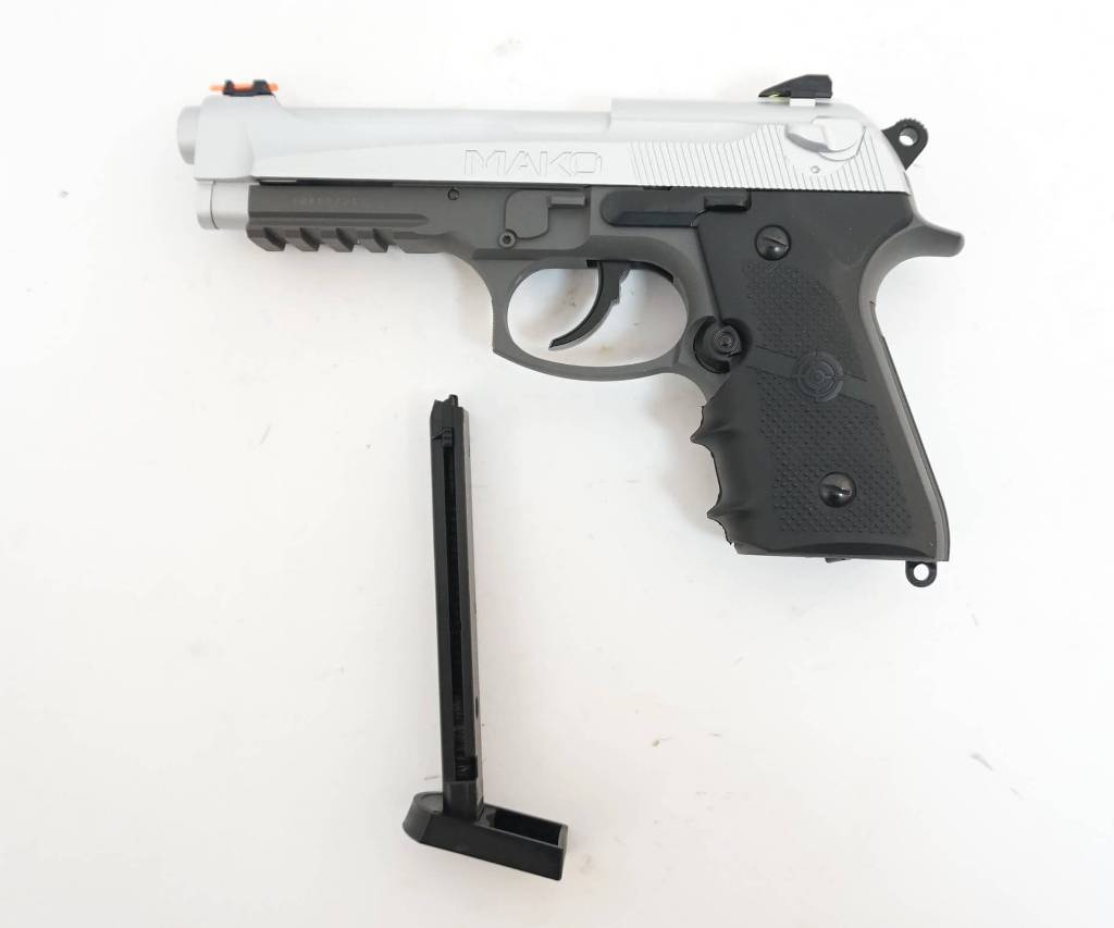 Пистолет Кросман СМ9В Мако это аналог современной 90-ой беретты. Калибр ствола 4,5 мм, используются для стрельбы стальные шарики ВВ. Ствол гладкий. Сделан на оружейном заводе в Америке. Подходит для развлечения и учебной стрельбы. В качестве источника энергии используется баллон СО2 12 г. с жидким углекислым газом. Скорость вылета пули 120 м/с, что является довольно приличным показателем для пистолета такой массой и за небольшие деньги. С одной стороны, цена пневматического пистолета Кросман СМ9В Мако завышена, с другой стороны по мощности и техническим характеристикам он не уступает более дорогим аналогам других фирм. Затвор подвижный. Внизу на планку можно установить лазерный прицел или тактический фонарь. Пистолет вызывает противоречивые чувства. Предохранитель выполнен дешево, он не флажковый. В этой модели металлический затвор, пластиковая рамка, на рукояти пластиковые накладки. Магазин из металла. Задняя крышка для баллона туго отстегивается. В пневматике есть скромный блоубек, что дает подобие стрельбы с боевого оружия. С другой стороны, экономится энергия баллона. Целик регулируется, мушка стабильная, на прицельных приспособлениях нанесена контрастная краска и есть нити для более точного прицеливания. Магазин полноразмерный. Заряжается через небольшое отверстие в магазине. Этот пневматический пистолет подойдет тем, кто любит что то оригинальное, и кому нравится оружейная марка “беретта”. Это нестандартная компоновка смеси 90 и 92-ой беретты. Для Екатеринбурга: