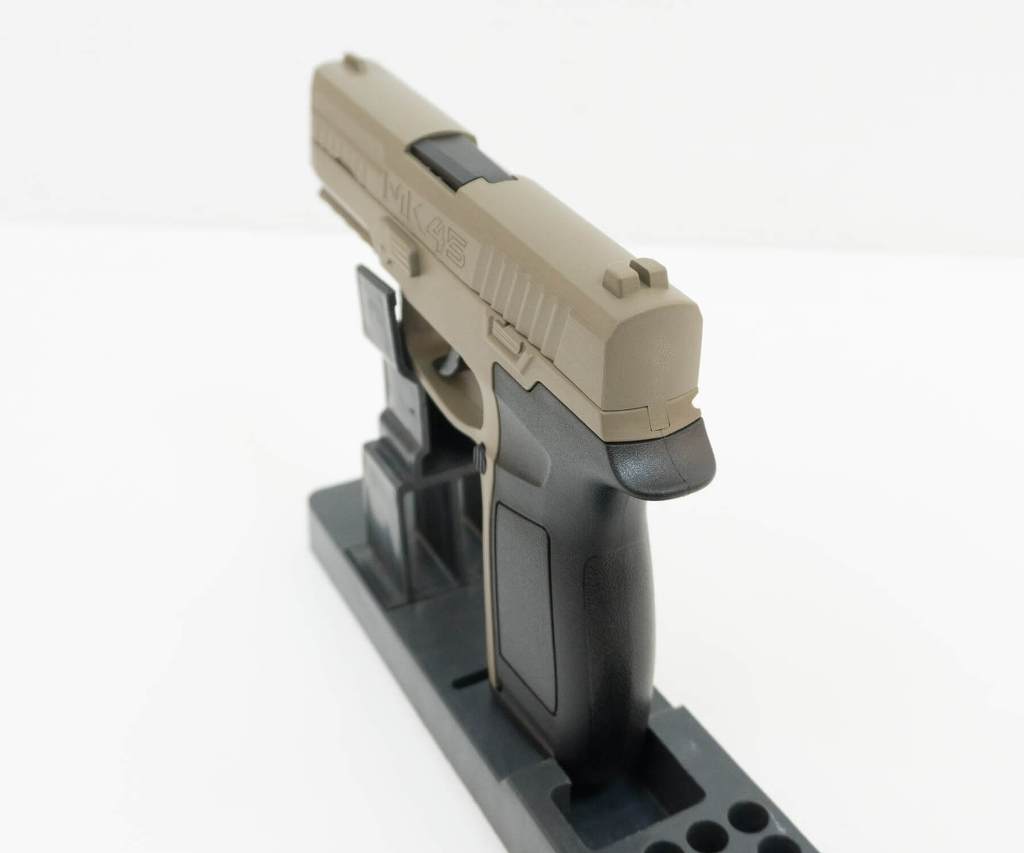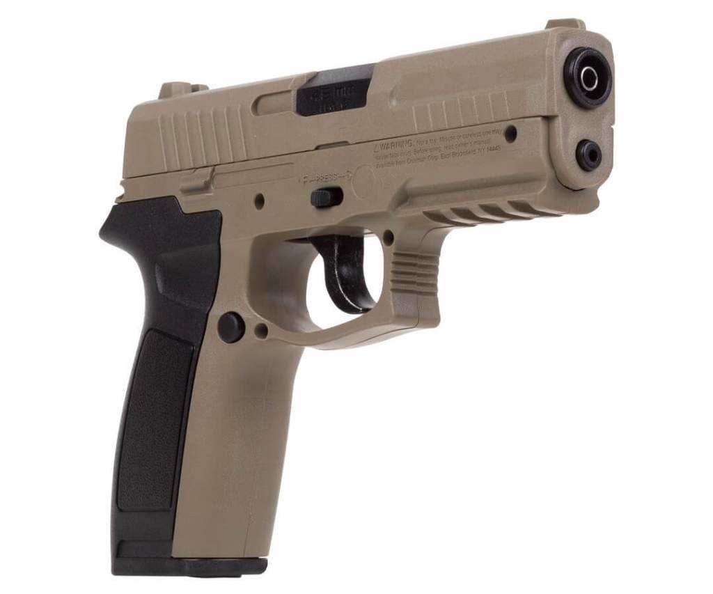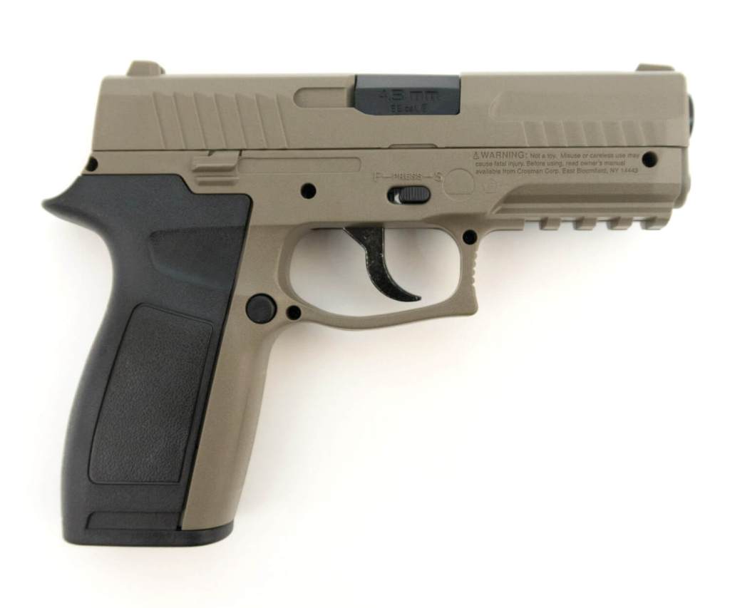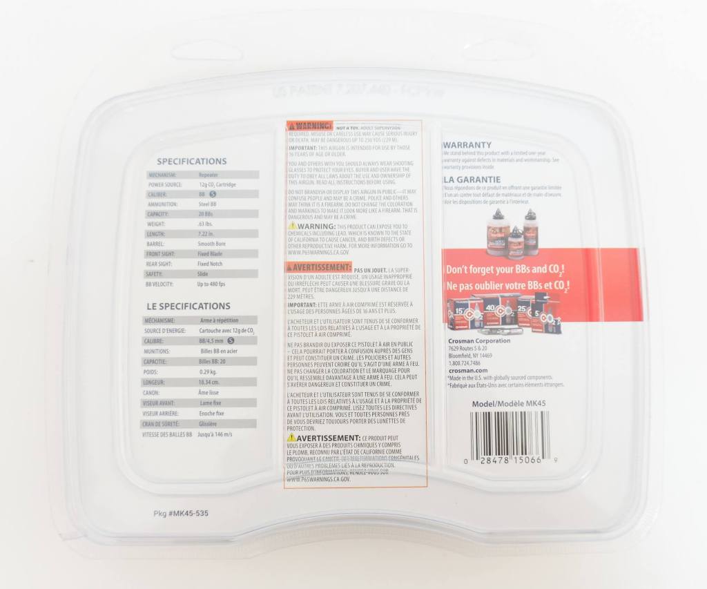 Crosman MK 45 - пневматический пистолет газобаллонного типа отлично подойдет для развлекательной стрельбы. Баллон с углекислым газом служит источником энергии, сдвинув накладки в сторону, он легко ставится в рукоять. Стрельба из оружия ведется ВВ шариками. Емкость палочного магазина 20 шариков. Прицельные приспособления состоят из целика и мушки, на подствольную планку можно закрепить дополнительные аксессуары. Для Екатеринбурга: