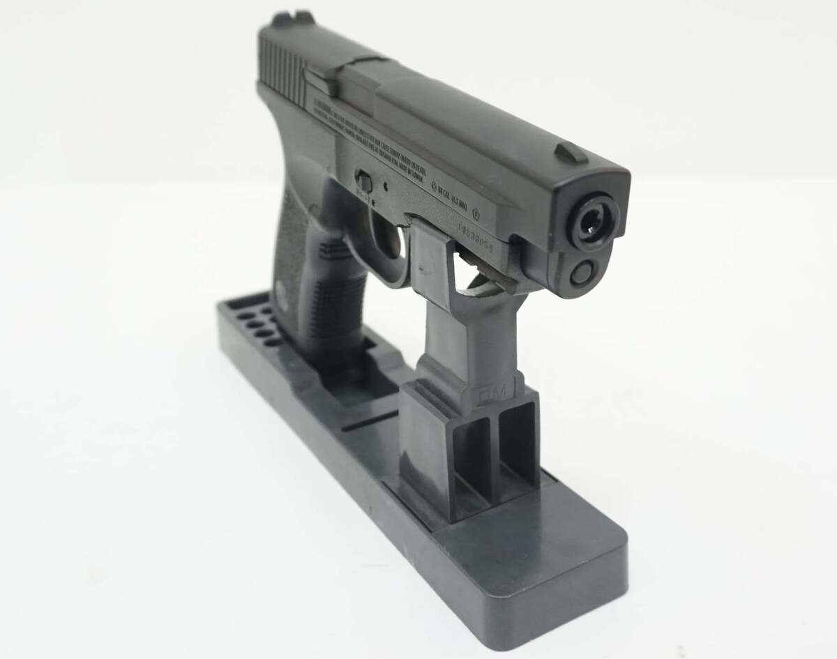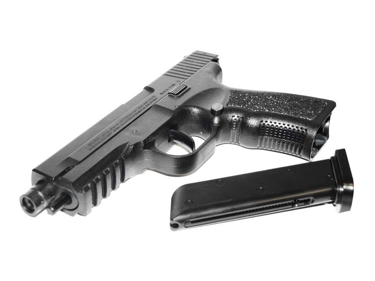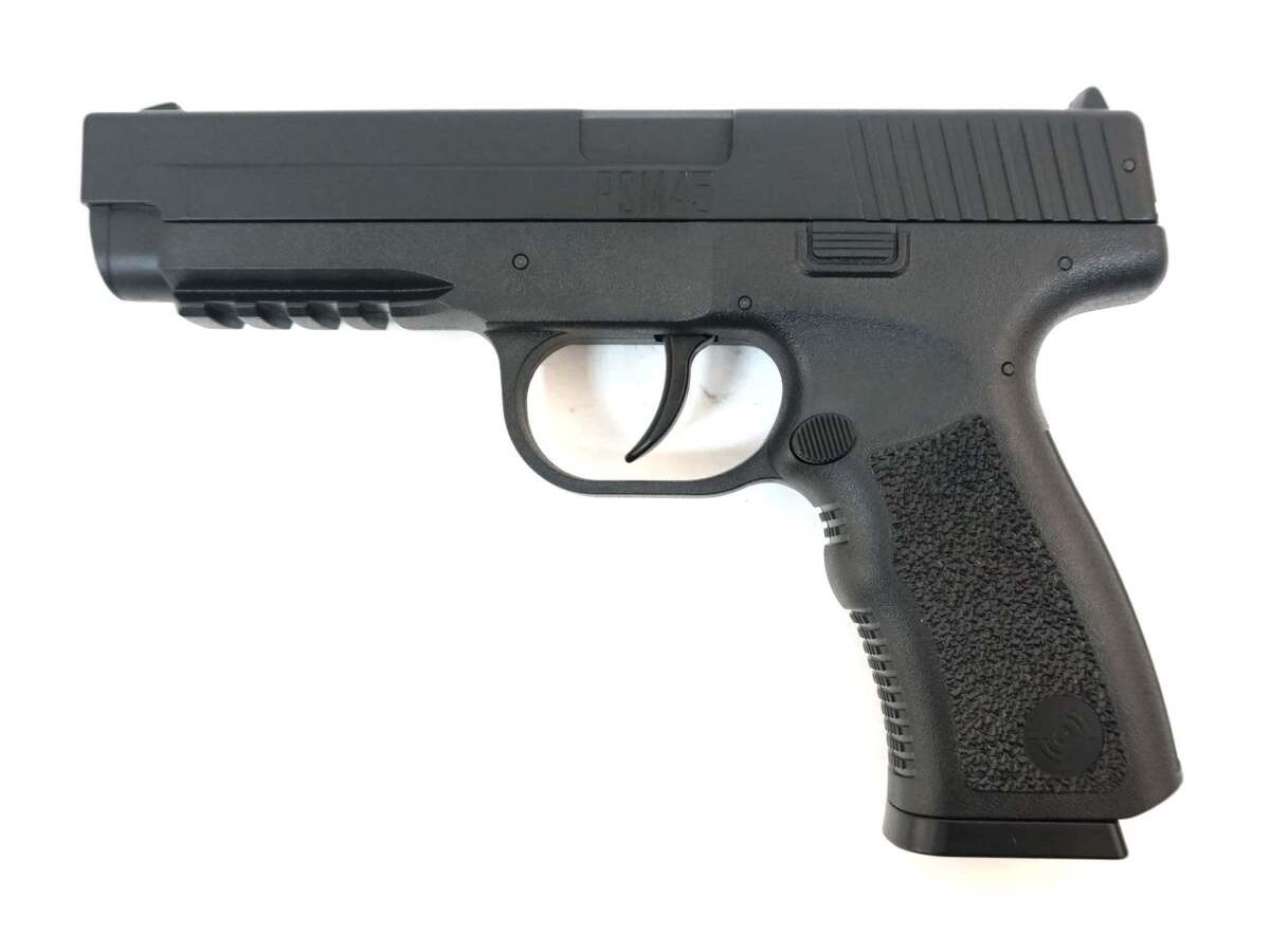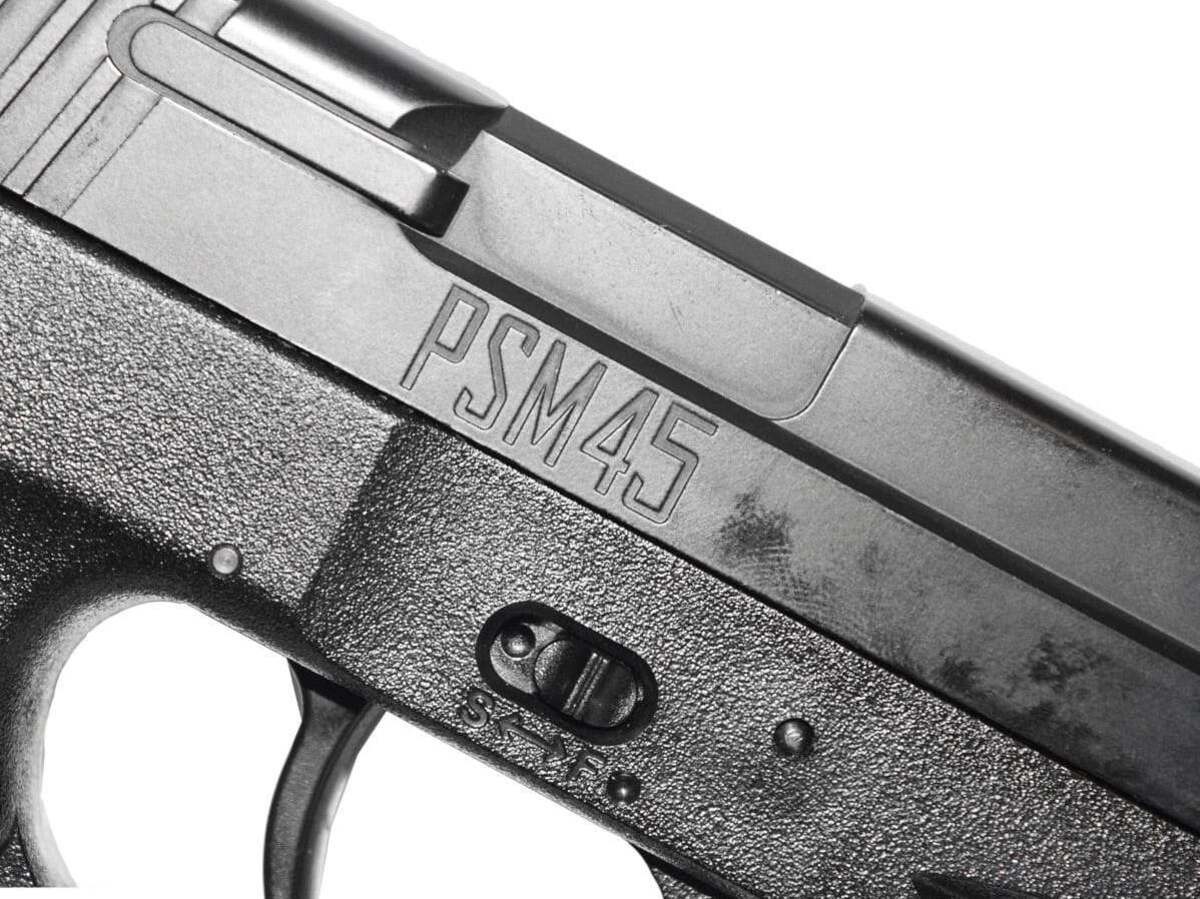 Пневматический пистолет Crosman PSM45 (Glock 17) – это пружинно-поршневая модификация, разработанная американским брендом и собранная в Тайване. Пистолет имеет источник энергии в виде пружины, взводимой путем передергивания затвора. Безусловным достоинством такого оружия является отсутствие необходимости приобретать газовые баллончики, необходимые для газобалонной пневматики. Боеприпасы – шарики ВВ калибром 4,5 мм, в магазине 20 шариков. Скорость выстрела составляет 60 м/с. Несмотря на тот факт, что ствол у пистолета гладкий, кучность стрельбы хорошая за счет длины ствола. Предохранитель, расположенный на корпусе справа, обеспечивает безопасность стрельбы. УСМ оружия одинарного действия, стрельба ведется одиночными выстрелами. Показатель дульной энергии – не более 3 Дж, что позволяет покупать данный экземпляр без лицензии. На рукоятке слева расположена кнопка выбрасывания магазина. Мушка с целиком здесь нерегулируемые, ниже ствола расположена планка для возможности использования фонаря, ЛЦУ или других тактических аксессуаров. Кросман ПСM45 изготовлен из металла (затвор, ответственные детали) и полимерного материала высокого качества, и отличается высокой степенью надежности. Оружие имеет легкий вес – всего 0,6 кг, его длина – 20,6 см. Форма рукояти эргономичная, поверхность ее рифленая, что обеспечивает удобный захват оружия. Пистолет поставляет с паспортом и инструкцией.