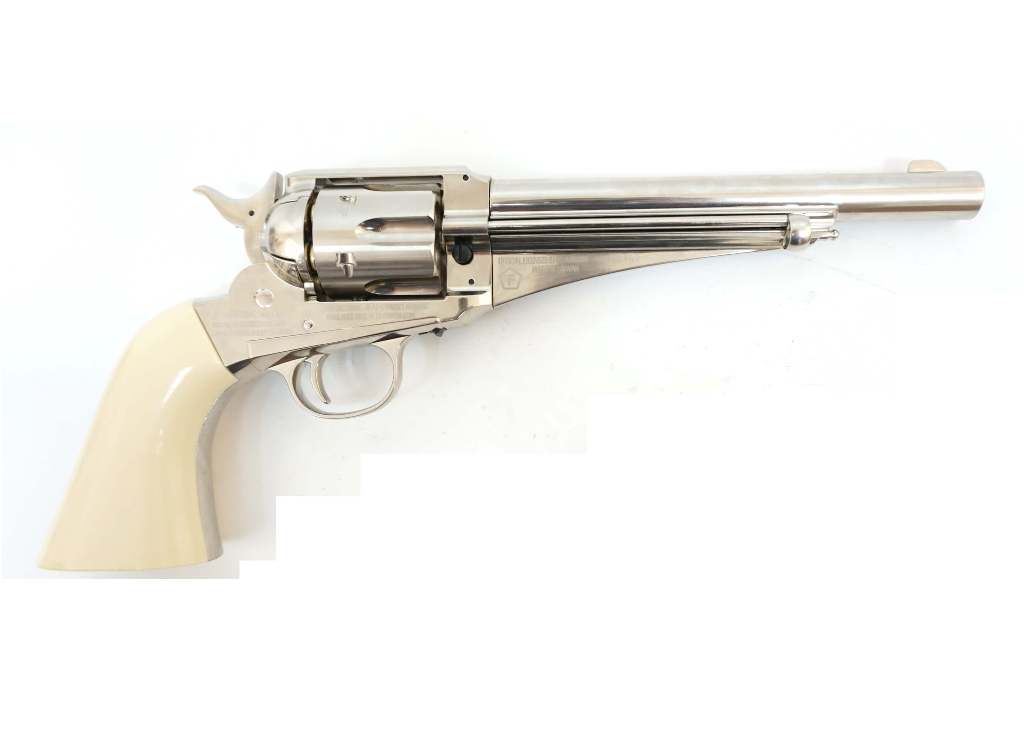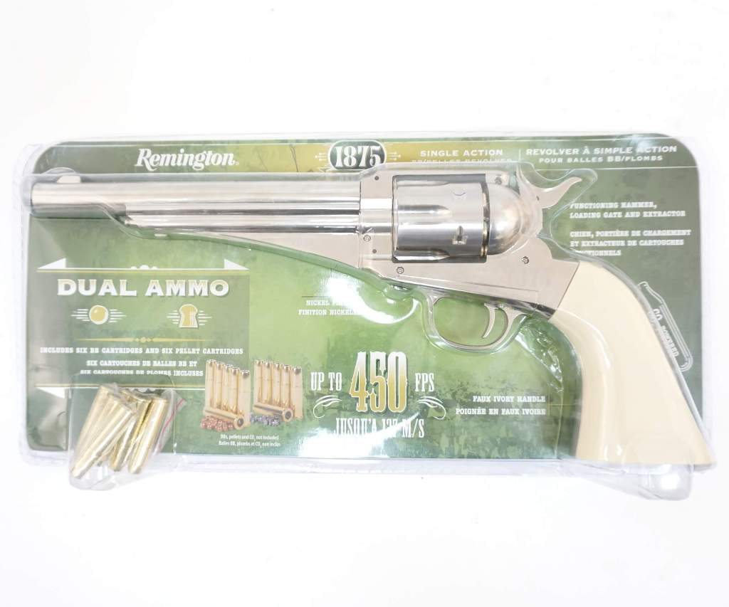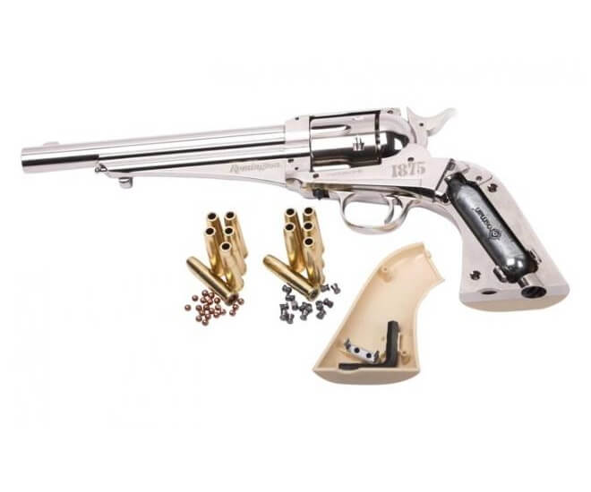 Пневматический револьвер Crosman Remington 1875 - это реалистичная копия оригинального револьвера 1875 года. Пневматический револьвер оснащен функциональными патронами, загрузочным воротами и экстрактором, что создает функциональность, аналогичную фактическому огнестрельному оружию 1875 года. Размещение ручного предохранителя - в нижней части рамки перед спусковой скобой не портит копийности револьвера. Углекислый баллончик СО2 устанавливается в рукоять револьвера, порсле снятия накладки с левой стороны. Для Екатеринбурга:
