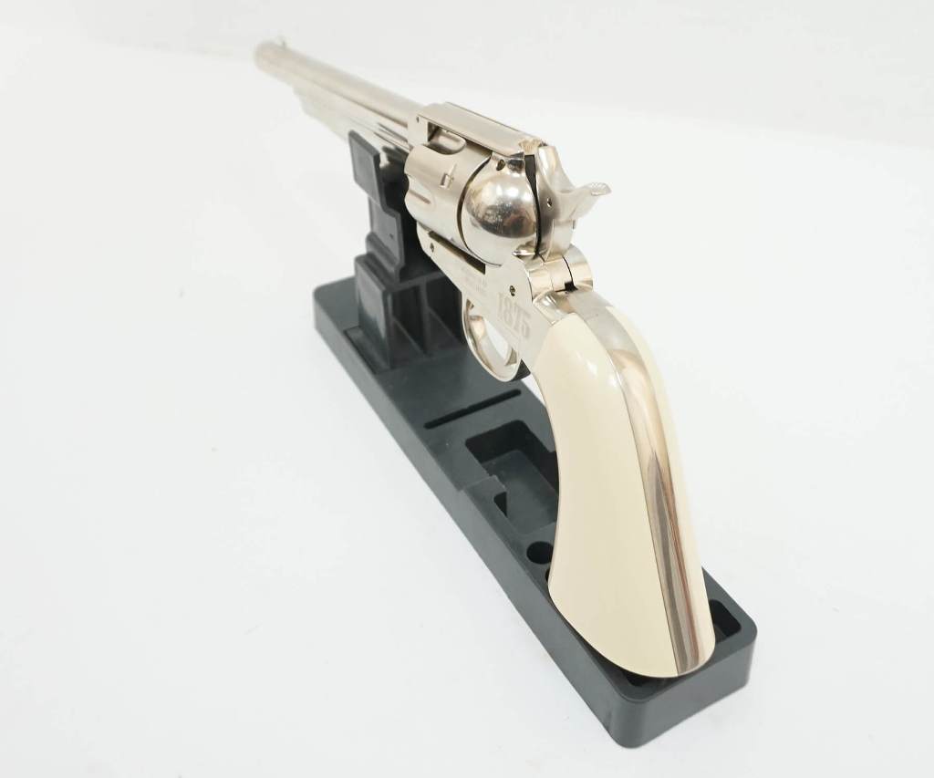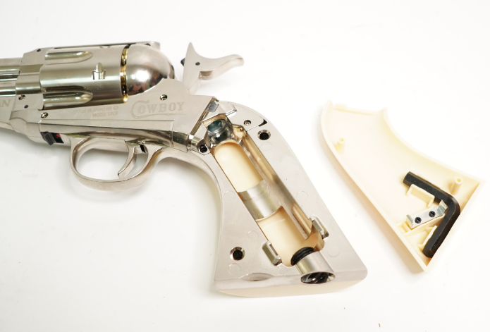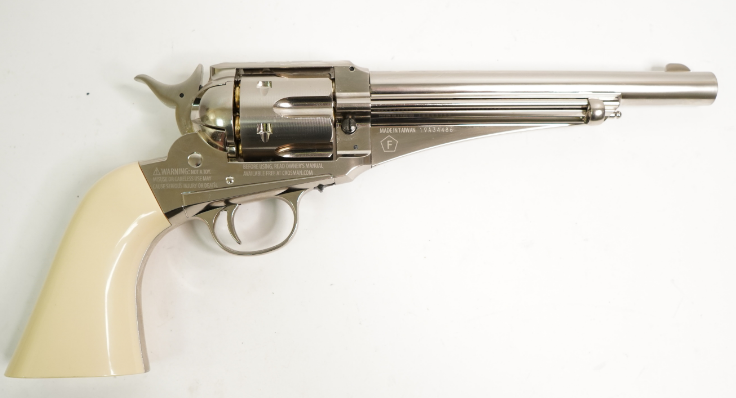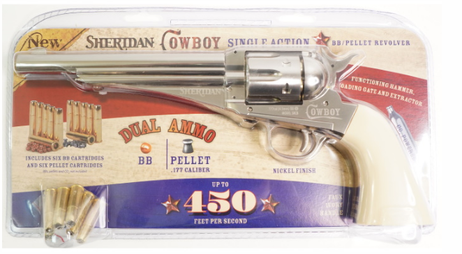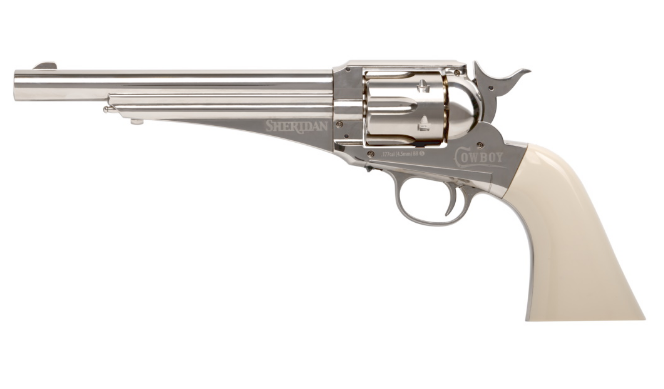 Пневматический револьвер Crosman Sheridan Cowboy - это реалистичная копия оригинального револьвера Remington 1875 года. Данная модель - абсолютно идентична модели Crosman Remington 1875 Пневматический револьвер оснащен функциональными патронами, загрузочным воротами и экстрактором, что создает функциональность, аналогичную фактическому огнестрельному оружию 1875 года. Размещение ручного предохранителя - в нижней части рамки перед спусковой скобой не портит копийности револьвера. Углекислый баллончик СО2 устанавливается в рукоять револьвера, порсле снятия накладки с левой стороны. Для Екатеринбурга: