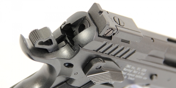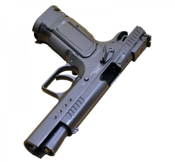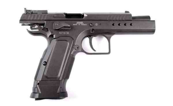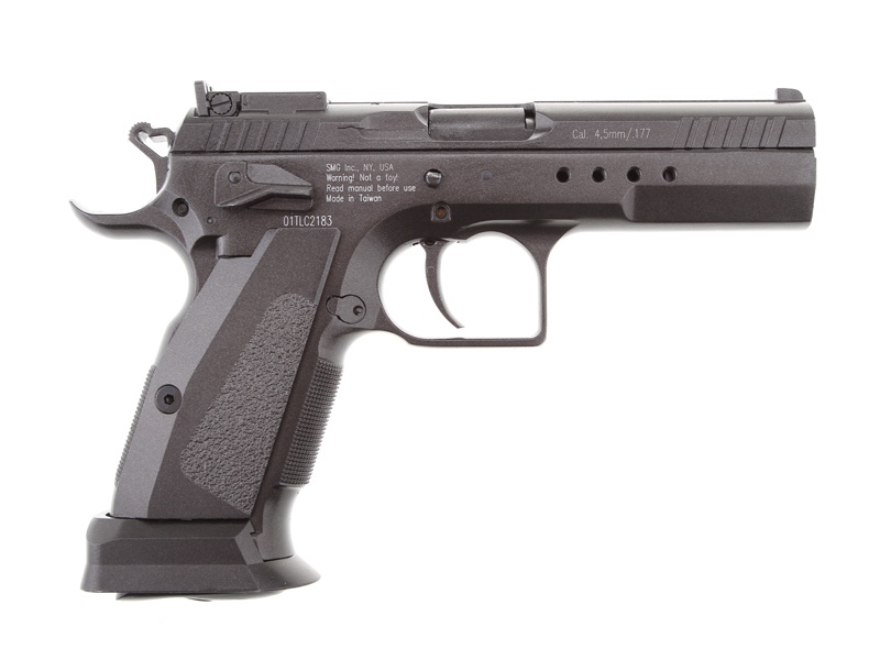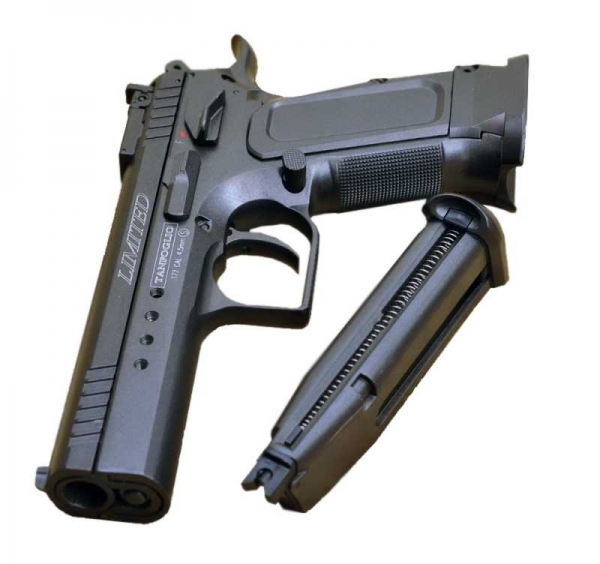 Пистолет пневматический Cybergun (Swiss Arms) Tanfoglio Limited Custom: - габаритные характеристики, идентичные оригиналу - вес, сходный с весом огнестрельного аналога - подвижный затвор - система Blowback, обеспечивающая движение затвора, для имитации отдачи и большей реалистичности при стрельбе - действующая затворная задержка - ударно-спусковой механизм одинарного действия (Single Action), обеспечивающий стрельбу с предварительным взведением курка - скрытый поджимной винт баллона, обеспечивающий большую визуальную схожесть с оригиналом - магазин пистолета полноразмерный, металлический, вмещающий в себя и дробь, и баллон CO2