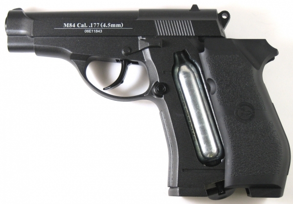 Пистолеты Beretta серии 8Х были впервые выпущены итальянской компанией Pietro Beretta SPa в 1976 году. Первыми появились модели 81 и 84, вскоре за ними последовали модели 82 и 85. Все эти пистолеты имели одинаковую конструкцию и габариты, отличаясь только калибром (модели 81 и 82 – 7.65мм Браунинг, модели 84 и 85 – 9х17мм Браунинг Короткий), а так же емкостью магазинов (модели 81 и 84 имеют двухрядные магазины на 12 и 13 патронов соответственно, модели 82 и 85 – однорядные на 8 патронов). В 1986 году появился пистолет Беретта модель 86, являвшийся гибридом из пистолета модель 85 и более раннего пистолета модель 950. Пневматический пистолет Cybergun M84 (Swiss Arms P84):