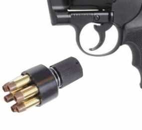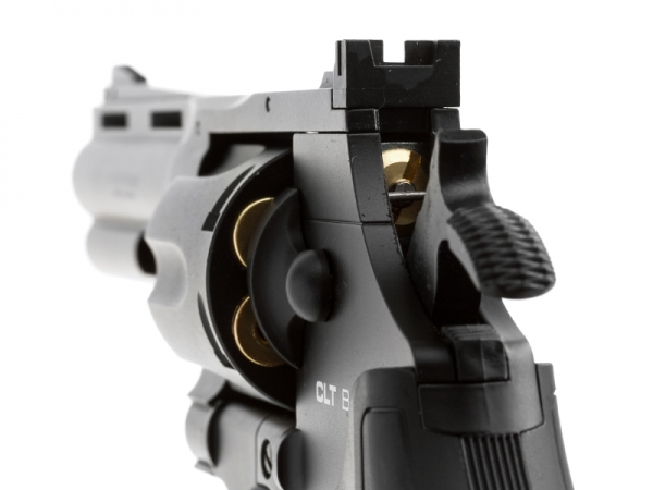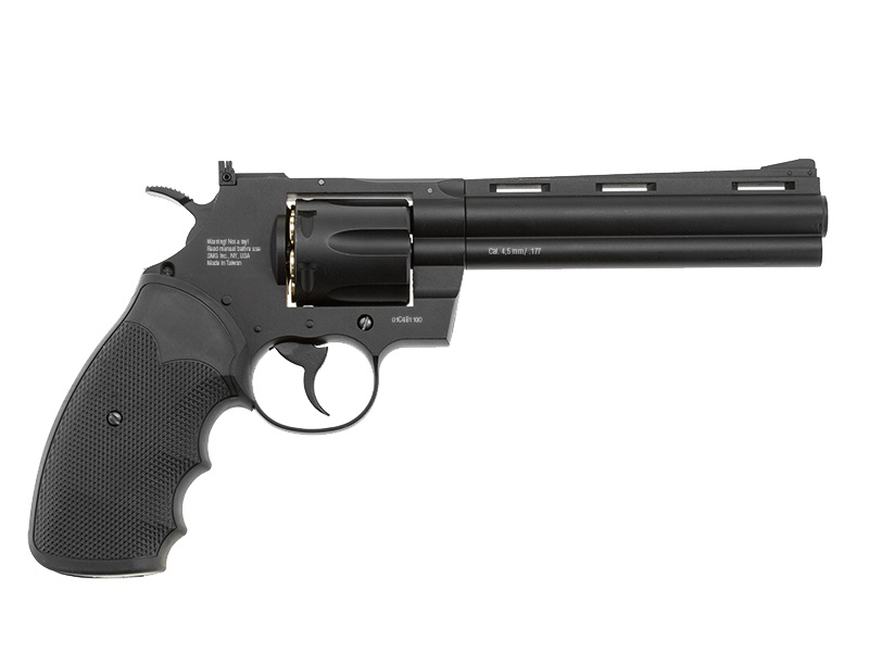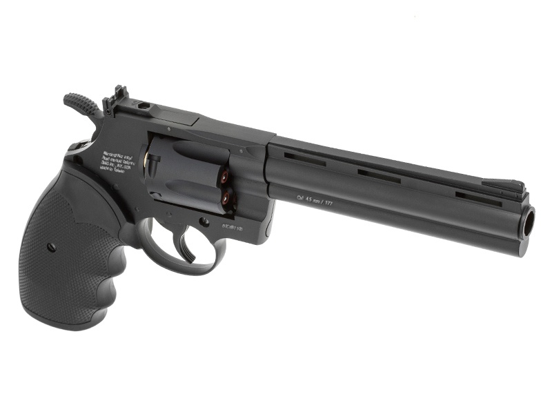 Револьвер пневматический Swiss Arms 357-6 является пневматической репликой одного из самых узнаваемых револьверов — Colt 357. Еще одно название модели — Colt Python. Револьвер вполне закономерно получил его из-за увеличенной длины ствола. Корпус модели делается полностью металлическим, рукоятка выполняется из черного пластика с рифленой поверхностью. Ствол изнутри гладкий, его внушительная длина (чуть более 15 см) обеспечивает высокую точность стрельбы. Пистолет пневматический Swiss Arms 357-6: