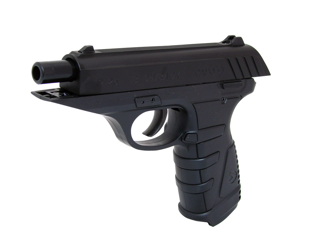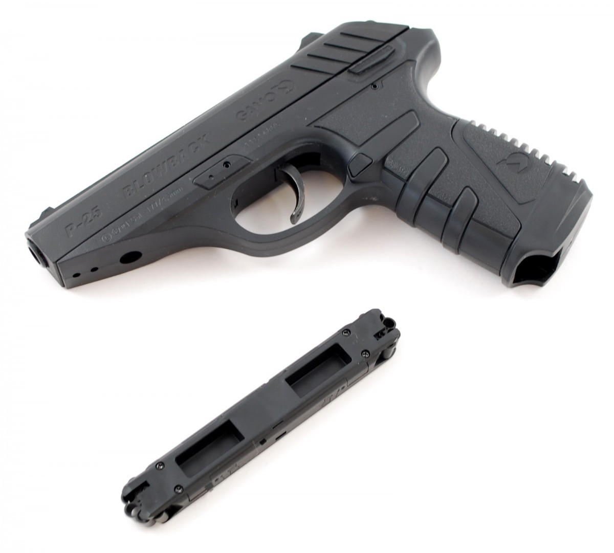 Главная особенность - система Blowback, которая имитирует отдачу боевого оружия. Ствол Gamo P-25 Blowback стальной, нарезной. Все основные внешние и внутренние механизмы сделаны из металла, корпус изготовлен из ABS пластика.