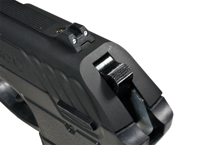 Ударно-спусковой механизм двойного действия. Предохранитель неавтоматический, флажкового типа. Имеются прицельные приспособления в виде мушки и целика. С одного баллона СО2 12 гр. можно произвести до 60 выстрелов.