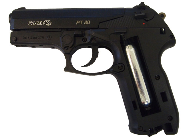Пневматический пистолет GAMO PT-80 – одна из самых удачных моделей испанской компании Gamo. Оружие это быстро завоевало доверие и уважение, как начинающих, так и бывалых стрелков. Новичков привлекает аккуратный дизайн и практичность пистолета, а профессионалам импонирует его мощность и точность стрельбы. Внешне, как и большинство пистолетов Гамо, модель PT-80 крайне схожа со многим огнестрельным оружием, в частности с Береттой 8000. Это, несомненно, тоже довольно большой плюс. Всем ведь известно, что стрелять из пневматики, имитирующей боевой пистолет, вдвойне интереснее. Скорость выстрела из пистолета данной модели равна 120 м/с. Источник энергии выстрела GAMO PT-80 – баллон с углекислым газом. Одного такого баллона вполне достаточно для совершения 60-80 выстрелов, с одинаковой мощностью и дальностью полета пули. Пистолет оснащен предохранителем, ствол стальной нарезной. Для Екатеринбурга: