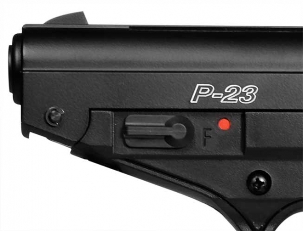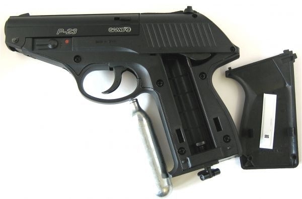 Популярный газобаллонный пистолет. Имеет нарезной стальной ствол, благодаря чему из него можно стрелять как стальными шариками ВВ, так и свинцовыми шарами Gamo Round. Прицельная планка регулируется вправо и влево. Предохранитель неавтоматический. Эргономичная рукоятка делает эту модификацию P-23 более удобной в обращении по сравнению с моделью Gamo P-23. Пистолет поставляется в кейсе, в комплект входит банка свинцовых шаров Gamo Round, 250шт Для Екатеринбурга: