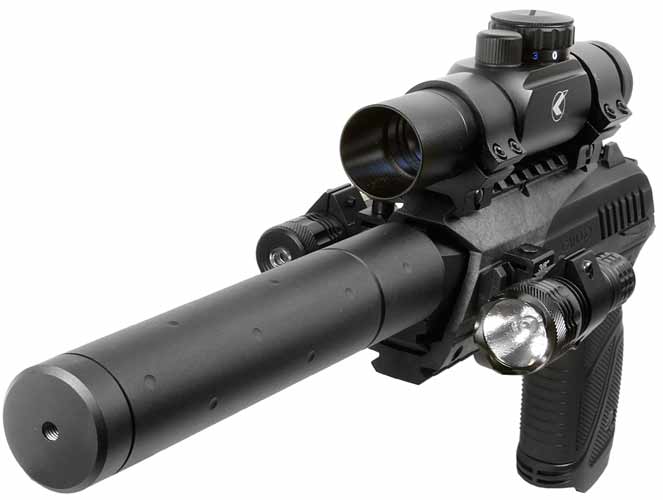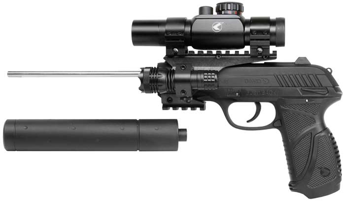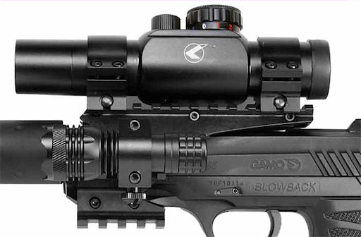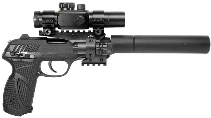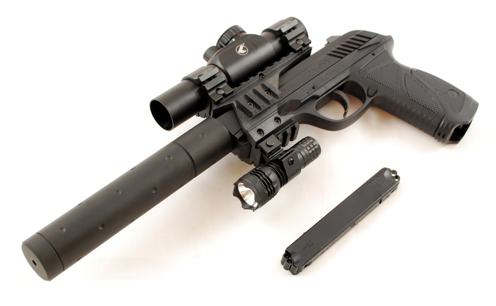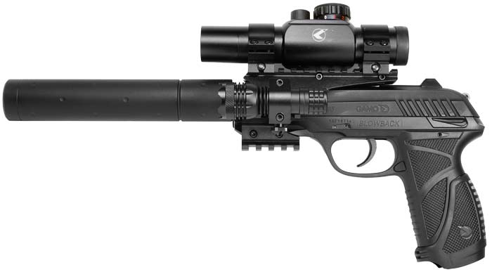 Пистолет GAMO PT-85 Tactical Blowback pellet разрабатывался как пневматическое оружие с уклоном в высокую точность и мощность стрельбы. Стартовая скорость его пули составляет целых 140 метров за секунду – отличный показатель для короткоствольной газобаллонной пневматики. Корпус пистолета выполнен в сочетании из сплавов металлов и высокопрочный полимерных пластиков, а его дизайн повторяет по стилю образцы современного огнестрельного боевого оружия. Применение системы Blowback делает пистолет по-настоящему сходным с боевым оружием, ведь она обеспечивает имитацию отдачи при стрельбе вместе с возвратно-поступательным движением затворной рамки. В конструкции также применяется ударно-спусковой механизм двойного действия и флажковый предохранитель ручного типа. Установлен ствол увеличенной длины с внутренними нарезами, изготовленный из высококачественной стали. Магазин этой модели – пластиковый, имеет два барабана-клипа на 8 зарядов каждый. Энергию выстрела обеспечивает двенадцатиграммовый баллон со сжатым углекислым газом, которого в среднем хватает на шестьдесят выстрелов. В комплекте c пневматическим пистолетом GAMO PT-85 Tactical поставляются: коллиматорный прицел, тактический фонарь и лазерный целеуказатель, а также батарейки к ним. ЛЦУ эффективен на ближних дистанциях. Коллиматорный прицел имеет 11 ступеней яркости. Для крепления этих аксессуаров на пистолете установлены планки Пикатинни. Для Екатеринбурга: