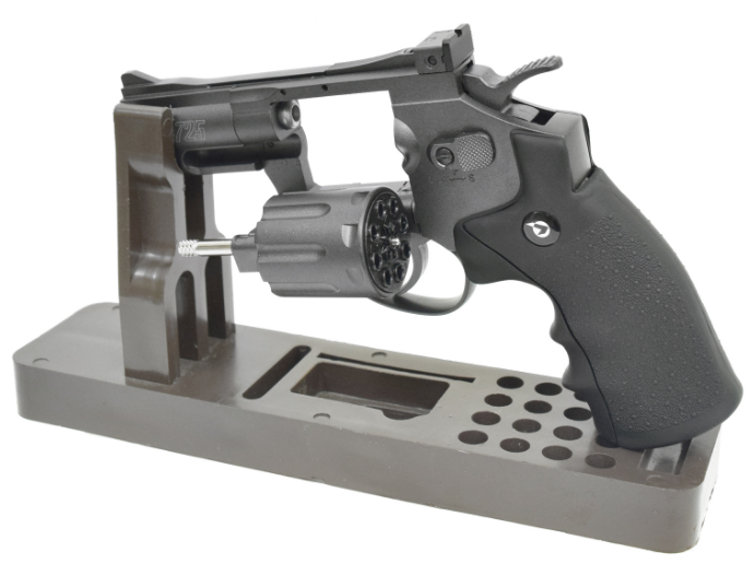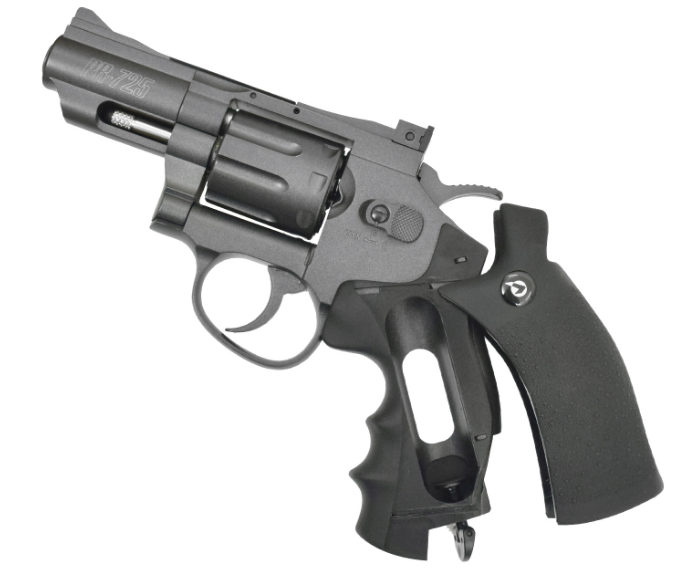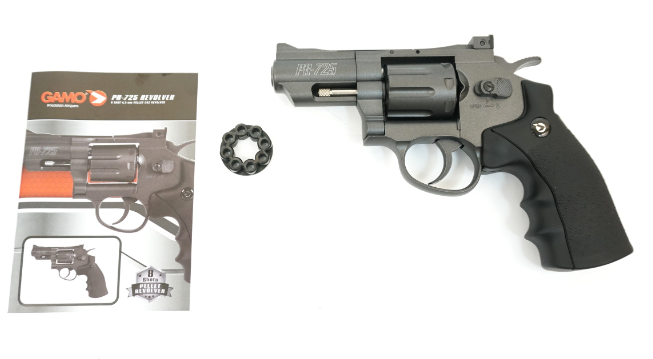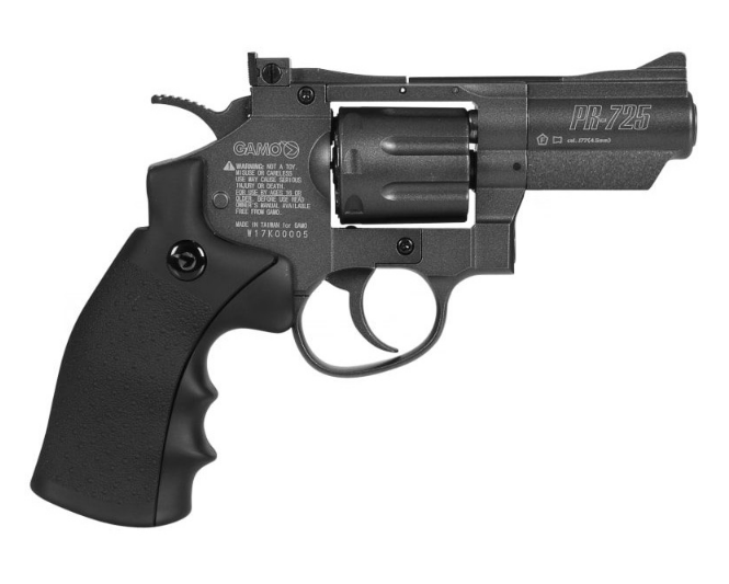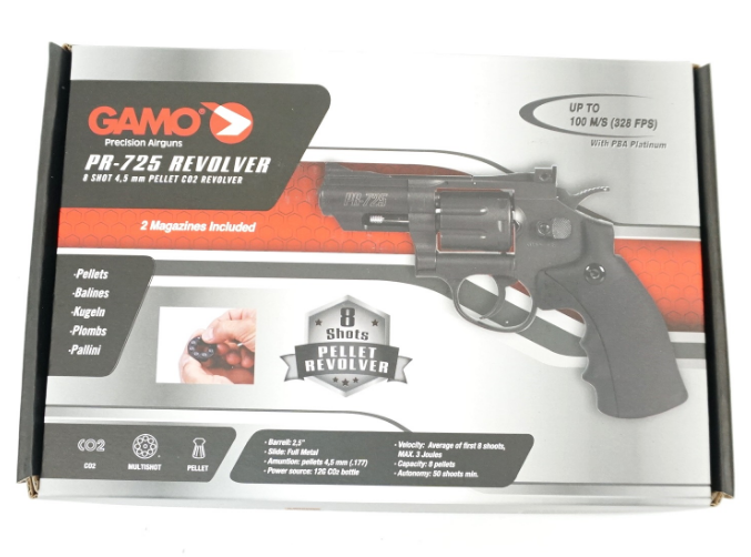 Пневматический револьвер Gamo PR-725 - новинка 2018 года! Купить пневматический пистолет Gamo PR-725 можно всем фанатам американских револьверов. Приобрести можно без специального разрешения на ношения и хранение оружия, так как Гамо поставляет свои изделия с дульной энергией соответствующей ограничениям в российском законодательстве. Помимо этого наш интернет-магазин осуществляет отправки пневматики почтой или транспортной компаний в любую точку России. Так как это газобалонный револьвер, то в качестве источника энергии в нем применяется баллон со жатым газом СО2 массой в 12 грамм. Для замены баллона достаточно просто отодвинуть пластиковую накладку на рукоять в сторону. Одного баллона хватит в среднем на 60 выстрелов, а его мощности достаточно, чтобы задать начальную скорость полета боеприпаса до 110 м/с. В качестве боеприпасов задействуются свинцовые пули для пневматики калибра 4.5 мм. Рекомендуем использовать пули весом не более 0.5 грамм. Магазин в виде барабана рассчитан на 8 боеприпасов, в комплекте с моделью предусмотрены 2 таких магазина. Как и у боевого прототипа, барабан выдвигается вбок для комфортного заряжания. Для выдвижения барабана предусмотрена кнопка под большой палец правой руки, которая также является неавтоматическим предохранителем. Корпус Гамо ПР 725 полностью выполнен из металлического сплава, что гарантирует надежность конструкции и долгий срок эксплуатации. Длина всей модели всего 208 мм, а вес 890 грамм. Револьвер очень компактный и хорошо сбалансирован. Стрельба ведется в полуавтоматическом режиме, значит не нужно взводить модель после каждого выстрела Модификация отличается наличием кнопочного предохранителя. Целик регулируется в двух плоскостях. В комплект входит два барабана и паспорт. Для Екатеринбурга: