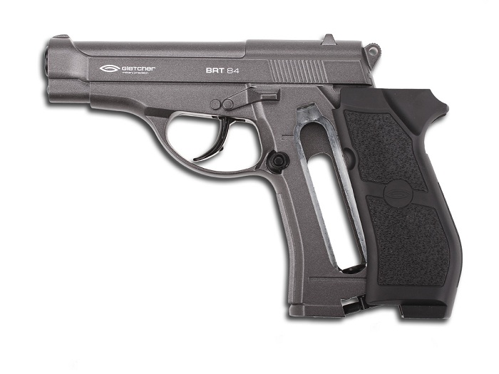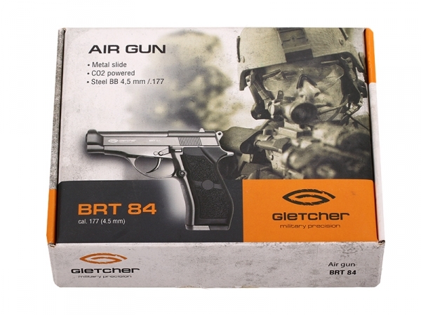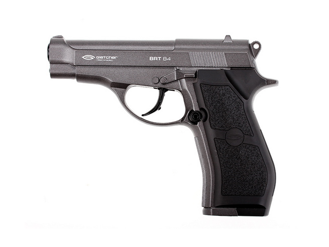 Пистолеты Beretta серии 8Х были впервые выпущены итальянской компанией Pietro Beretta SPa в 1976 году. Первыми появились модели 81 и 84, вскоре за ними последовали модели 82 и 85. Все эти пистолеты имели одинаковую конструкцию и габариты, отличаясь только калибром (модели 81 и 82 – 7.65мм Браунинг, модели 84 и 85 – 9х17мм Браунинг Короткий), а так же емкостью магазинов (модели 81 и 84 имеют двухрядные магазины на 12 и 13 патронов соответственно, модели 82 и 85 – однорядные на 8 патронов). В 1986 году появился пистолет Беретта модель 86, являвшийся гибридом из пистолета модель 85 и более раннего пистолета модель 950. Пневматический пистолет Gletcher BRT 84: