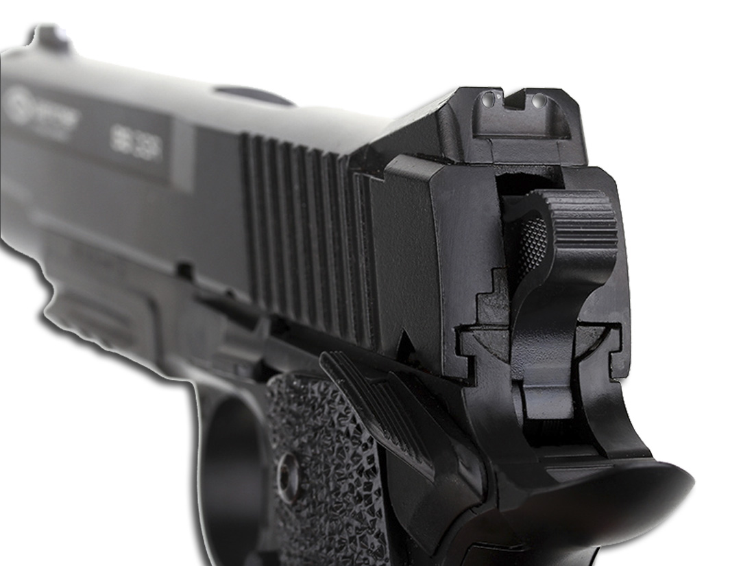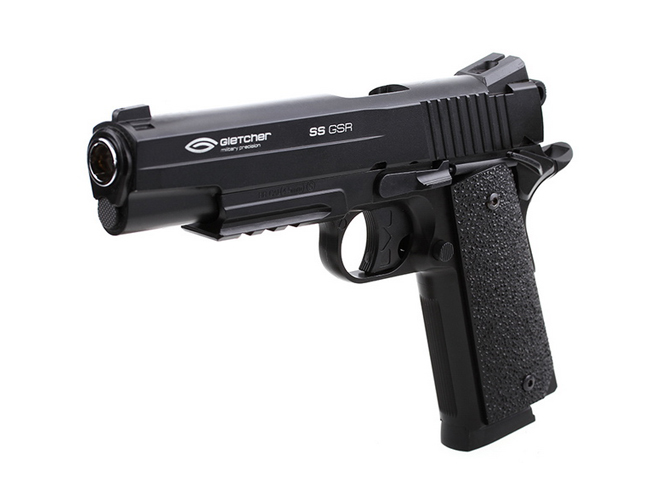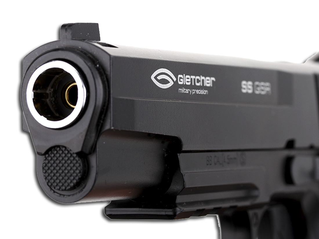 Пистолет пневматический Gletcher SS GSR: - габаритные характеристики, идентичные оригиналу - вес, сходный с весом огнестрельного аналога - оснащен предохранителем - ударно-спусковой механизм, обеспечивающий стрельбу только самовзводом (Double Action Only) - планка Weaver/Picatinny под стволом для крепления фонаря или ЛЦУ - скрытый поджимной винт баллона, обеспечивающий большую визуальную схожесть с оригиналом