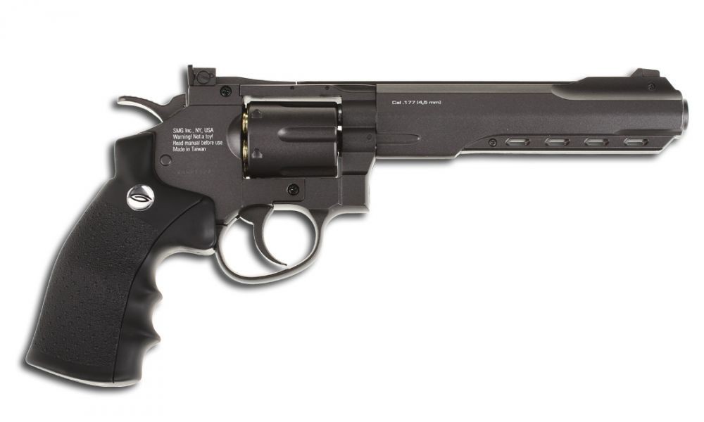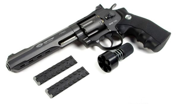 Пневматический револьвер Gletcher SW R6 Black точно такого же цвета, как и Gletcher SW R6 - тёмно-серого (графитового). Отличаюся эти 2 модели упаковкой и типом фальшпатрона: - Gletcher SW R6 Black поставляется в картонной коробке (Gletcher SW R6 поставляется в пластиковом кейсе) - у Gletcher SW R6 Black фальшпатроны цельные, пуля вставляется с тыльной стороны фальшпатрона, где ее фиксирует резиновый уплотнитель (у Gletcher SW R6 фальшпатрон состоит из двух частей, пуля заряжается в верхнюю часть) Обе модели пистолетов комплектуются ускорителем заряжания и планкой Weaver/Picatinny.