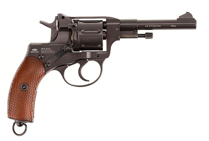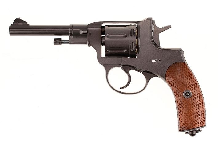 Револьвер пневматический Gletcher NGT R (Наган): - версия пневматического «нагана», предназначенного для стрельбы свинцовыми пулями - вес, идентичный оригиналу - ударно-спусковой механизм двойного действия (Double Action), обеспечивающий стрельбу как самовзводом, так и с предварительным взведением курка - накладки рукояти «под дерево», придающие револьверу аутентичный внешний вид - скрытый поджимной винт баллона, обеспечивающий большую визуальную схожесть с оригиналом - фальшпатроны, увеличивающие реалистичность обращения с револьвером - процесс заряжания и обращения с револьвером в точности соответствует боевому образцу