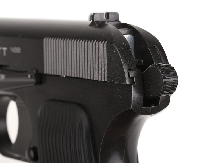 пистолет имеет подвижный затвор, но не оснащен системой Blowback (возврат затвора при стрельбе). Благодаря этому обеспечивается высокая начальное скорость дроби, повышенная точность стрельбы, сокращается расход газа
