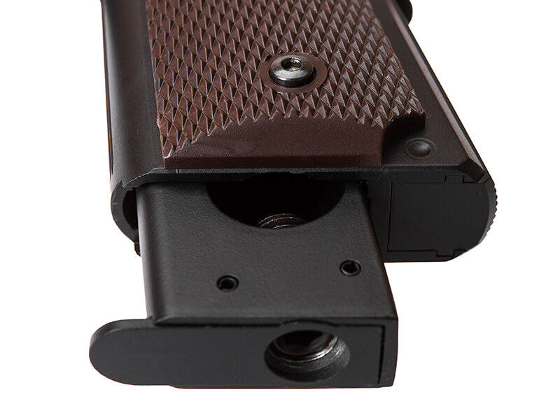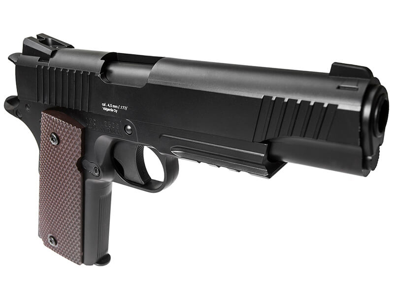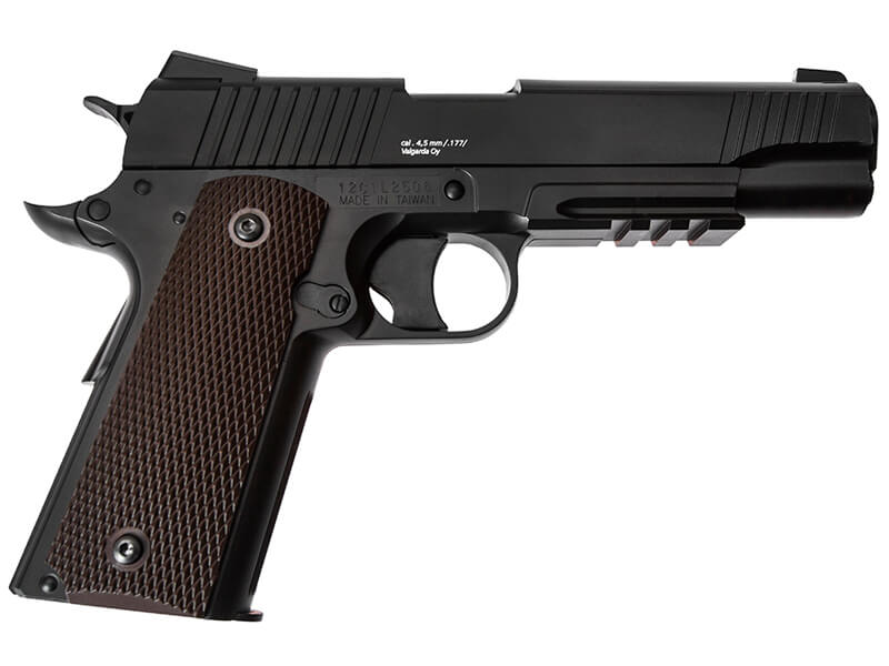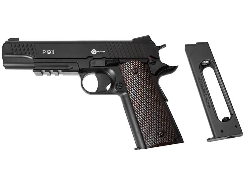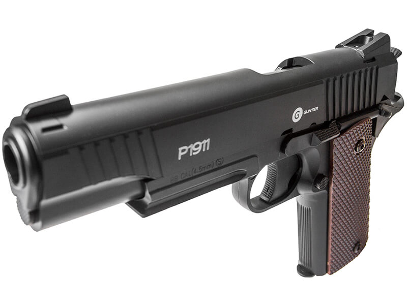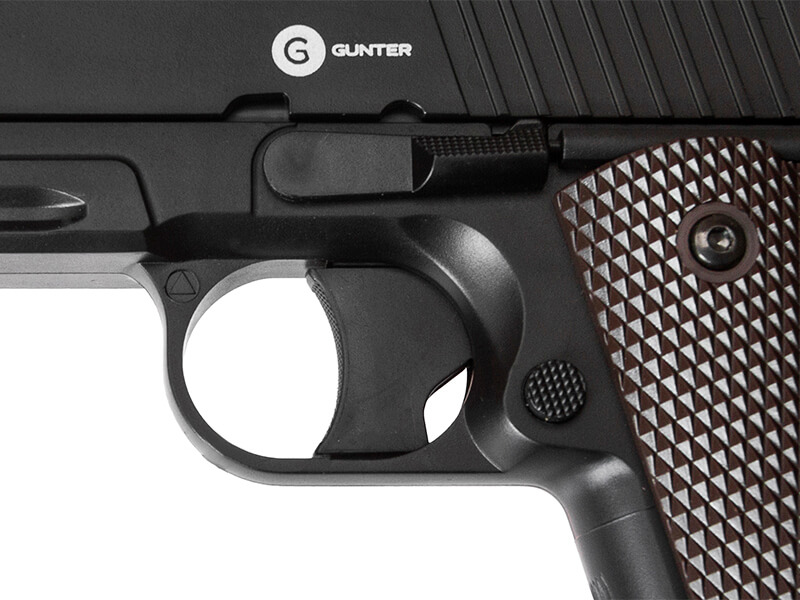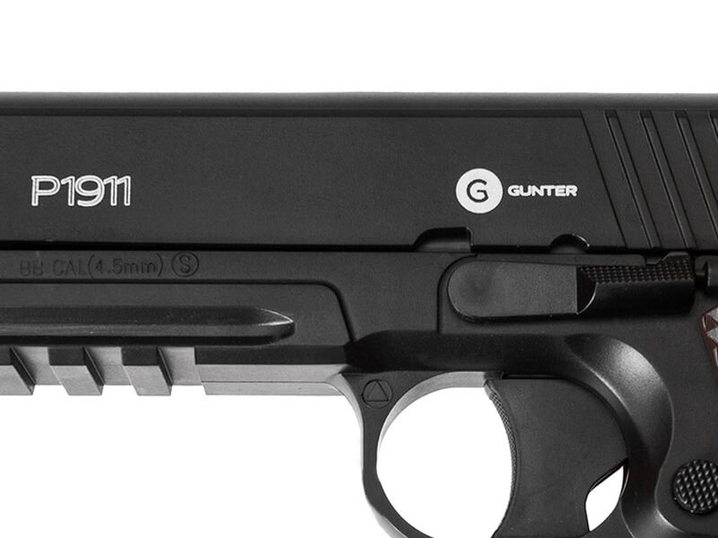 Пневматический пистолет Gunter P1911 - пневматическая версия легендарного Colt 1911. Причем одной из его современных модификаций. Имеет планку стандарта Weaver/Picatinny для установки подствольных прицелов, фонарей и других оружейных аксессуаров. На мушке и на целике белые метки для облегчения прицеливания, в том числе в условиях недостаточной освещённости.