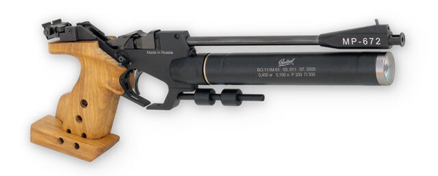 Пневматический пистолет МР-672 разработан на базе известного стандартного пневматического пистолета ИЖ-46. Пневмобаллонная схема обеспечивает большее удобство при стрельбе, чем компрессионная, не снижая характеристик кучности. Спусковой механизм у данной модели с регулировкой положения спускового крючка, хода и усилия спуска. Система "тренировочного спуска" позволяет спортсмену отрабатывать стрельбу, не используя клапанное устройство, что продлевает срок службы оружия. Ортопедическая деревянная рукоятка с регулируемым упором кисти обеспечивает комфортность при стрельбе. Для Екатеринбурга: