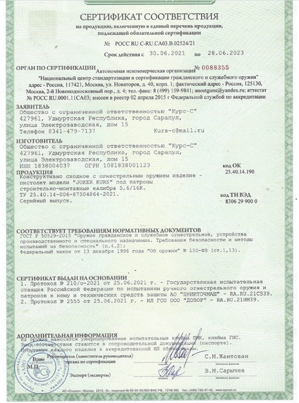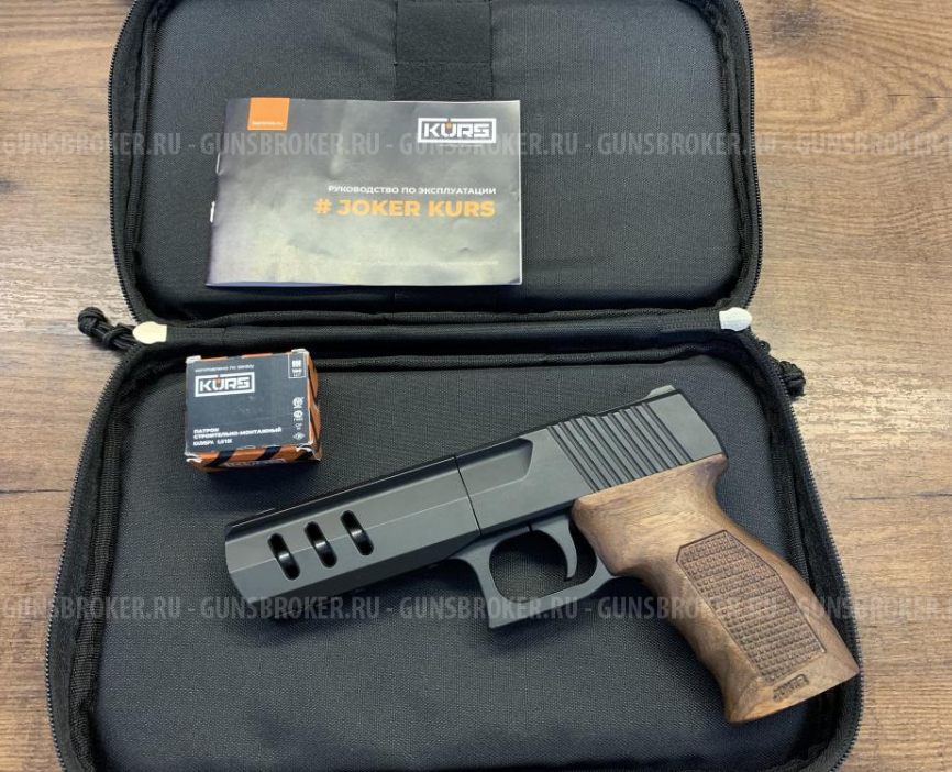 Видео-презентацию пистолета JOKER KURS можно посмотреть во вкладке Видео Оф. страница и полное описание : www.jokerkurs.ru . Там же размещен сертификат Пистолеты есть в наличии! Цвет можно выбрать в окошке, права от цены. Купить пистолет Joker KURS 5,5 мм (заказать на сайте) можно свободно с 18 лет! Не просто новинка, а настоящий переворот на рынке оружия! Комплектация: пистолет, сумка-кейс с ручками и боковым карманом, паспорт с сертификатом Пистолет JOKER KURS (Джокер Курс) калибра .22 продается БЕЗ ЛИЦЕНЗИИ, так как сертифицирован, и является конструктивно-сходным с оружием изделием! 1. Без лицензии и регистрации 2. Не имеет аналогов на рынке РФ 3. Нарезной ствол с 6 нарезами 4. Стреляет свинцовой пулей калибра 5,5 мм (JSB или Люман, например). Рекомендованый вес пули - 1г 5. Специально разработанный патрон 5,6/16К от МПЗ (Хилти и другие 5,6х16 не подойдут по длине!) 6. Цена патрона 9 рублей Ствол - Сталь 40Х (6 нарезов, шаг нарезов 406 мм) Для Екатеринбурга: