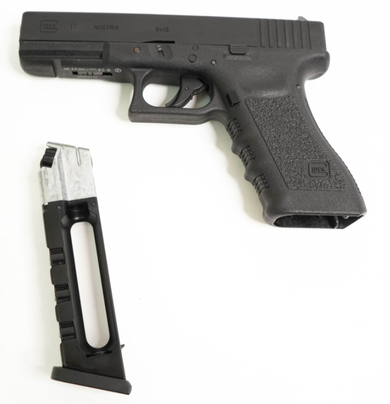 Пневматический пистолет Umarex 5.8365 Glock 17 (blowback, BB/pellet) – это выпущенный по лицензии аналог известного боевого пистолета, красивое и качественное газобаллонное вооружение для развлечений. Пистолет работает от энергии газа, заключенного в баллончик на 12 г, он установлен в отсек рукоятки. Боеприпасы для этого пистолета – это стандартные шарики ВВ или свинцовые пули 4,5 мм. Магазин вмещает 32 заряда (4 барабана по 8). Здесь реализована функция Blowback, имитирующая отдачу боевого изделия. Пистолет Umarex Glock 17 (blowback, BB/pellet) имеет УСМ двойного действия, подвижный затвор и оснащен неавтоматическим предохранителем на его спусковом крючке. Изделие показывает хорошую скорость выстрела – 110 м/с. Модель имеет нарезной ствол Материалы, используемые при производстве Umarex Glock 17 – металл и пластик. Модель выделяется высоким качеством сборки. Под стволом пистолета установлена подствольная планка для ЛЦУ или фонаря. Мушка и целик модели неподвижные. Для Екатеринбурга: