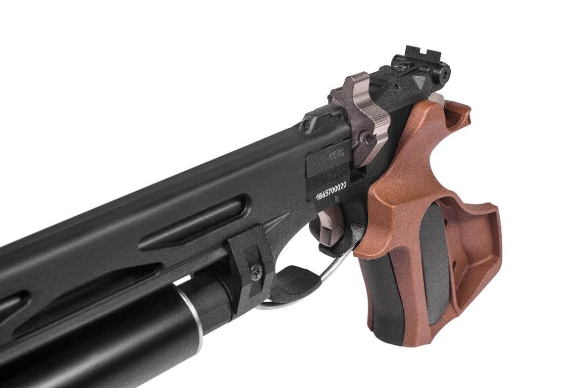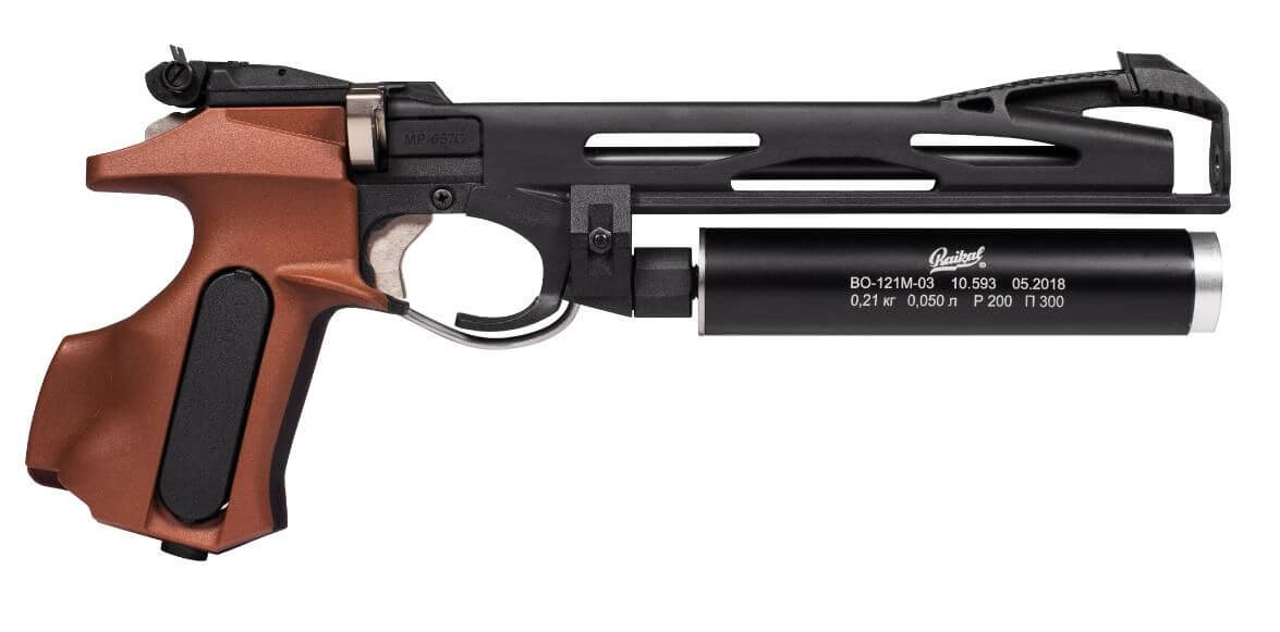 Пневматический пистолет МР-657-03 относится к спортивной пневматике высокого класса, рассчитанной на высокоточную стрельбу и имеющей оптимальные эргономические параметры. Изготавливается он из оружейной стали, с нарезным стволом, сколько рассчитан на стрельбу свинцовыми пулями. Стрельба ведется одиночными выстрелами, с применением пуль 4,5 мм. Пистолет относится к PCP-пневматике. В нем баллон размещается под стволом для сохранения оптимальной балансировки. Для обеспечения оптимального выстрела он снабжен оригинальной рукоятью, учитывающей физиологически правильное положение кисти при выстреле, для обеспечения максимальной точности стрельбы. Плотности контакта с оружием способствует глубокая выемка для захвата оружия, на рукояти, и наличие прорезиненных вставок на щечках и в подпальцевом углублении. Спусковой крючок выполнен с возможностью регулирования усилия, что обеспечивает возможность выбора, оптимального для стрелка. На пистолете установлено открытое прицельное устройство с оригинальной конструкции мушкой, которая позволяет не напрягать глаза при прицеливании, и регулируемой прицельной планкой. Для Екатеринбурга: