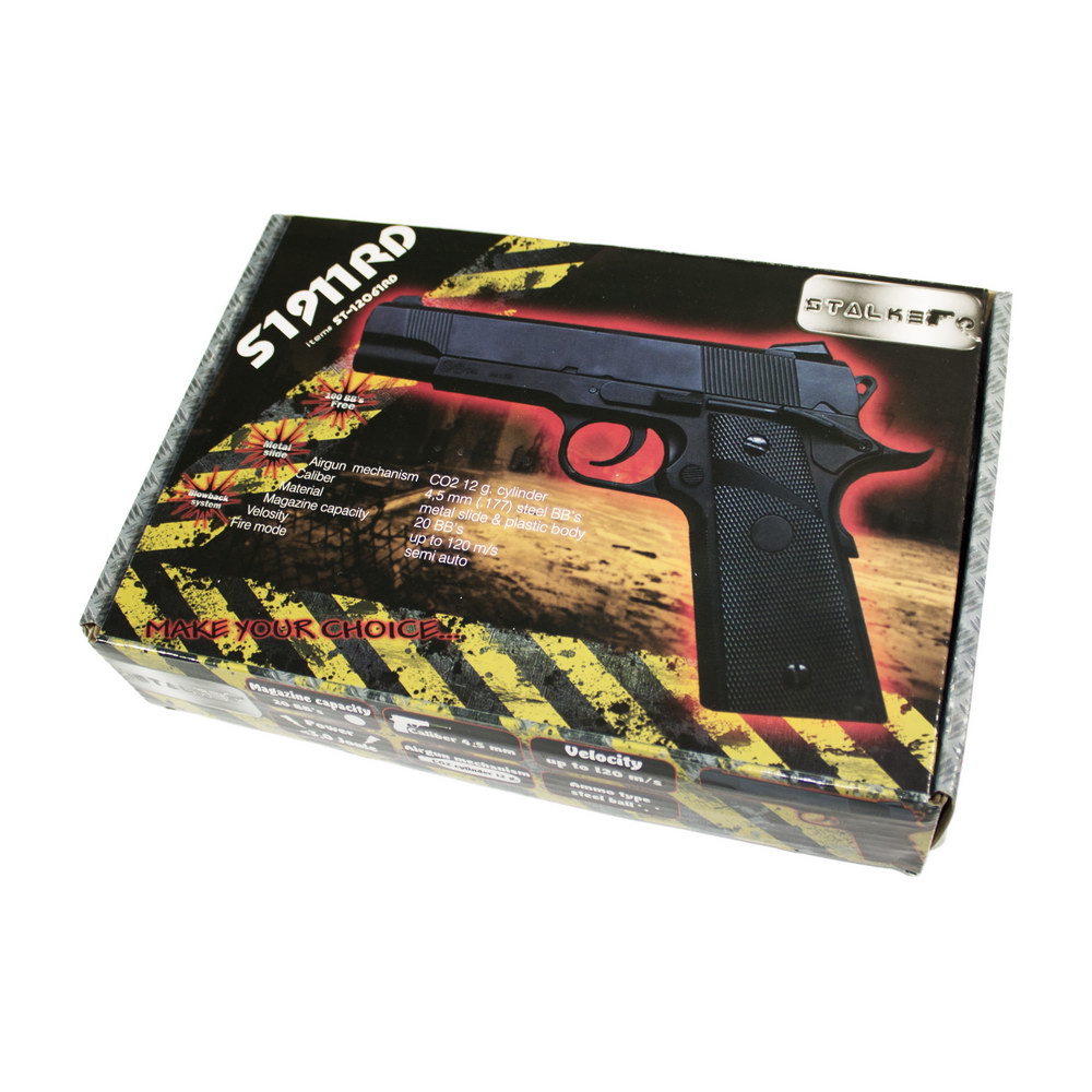 Пистолет пневматический Stalker S1911RD - пневматическая копия легендарного Кольта 1911 года. Оснащен системой блоу-бэк (имитация отдачи при стрельбе). Затворная рама выполнена из металла, нижняя часть пистолета из пластика Комплектация: инструкция на русском языке, 100 шариков ВВ, ключ-шестигранник для установки баллончика СО2 Для Екатеринбурга: