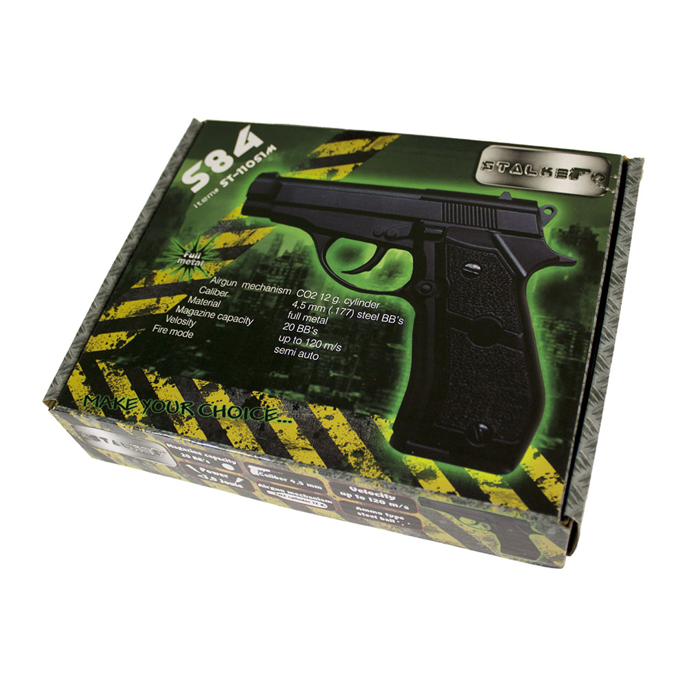 Пистолет пневматический Stalker S84 - пневматическая копия широко известной Beretta 84. Корпус пистолета выполнен из металла. Комплектация: инструкция на русском языке, ключ-шестигранник для установки баллончика СО2 Для Екатеринбурга: