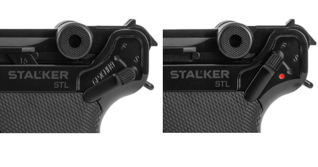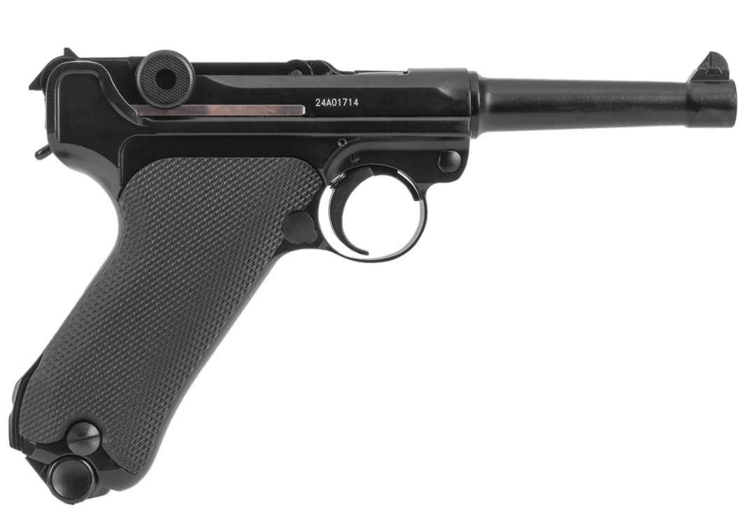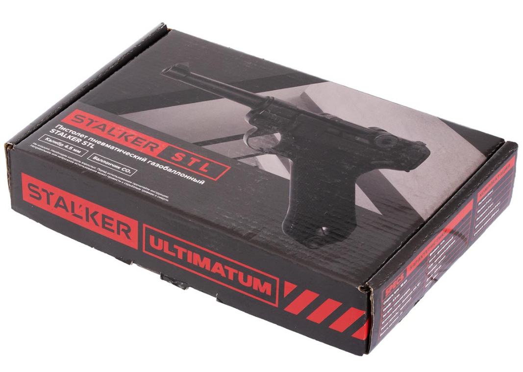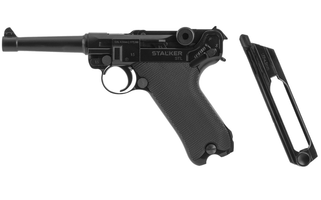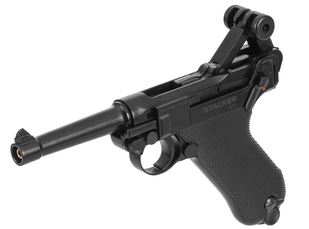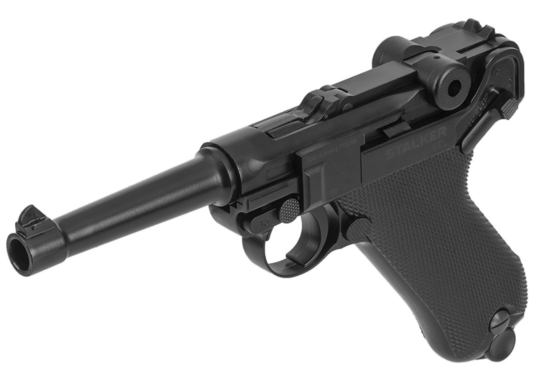Пневматический «парабеллум» STALKER STL, Luger P08 с системой blowback, калибра 4.5 мм под стальную дробь ВВ. Изюминка этого пистолета - точно воспроизведенная оригинальная система запирания затвора при помощи рычагов. Массогабаритные характеристики соответствуют легендарному пистолету Люгера (900 грамм). Анатомическая рукоять с большим углом наклона и легкий спуск, как и у огнестрельного оригинала. Ударно-спусковой механизм одинарного действия. Начальная скорость – 100 м/с.