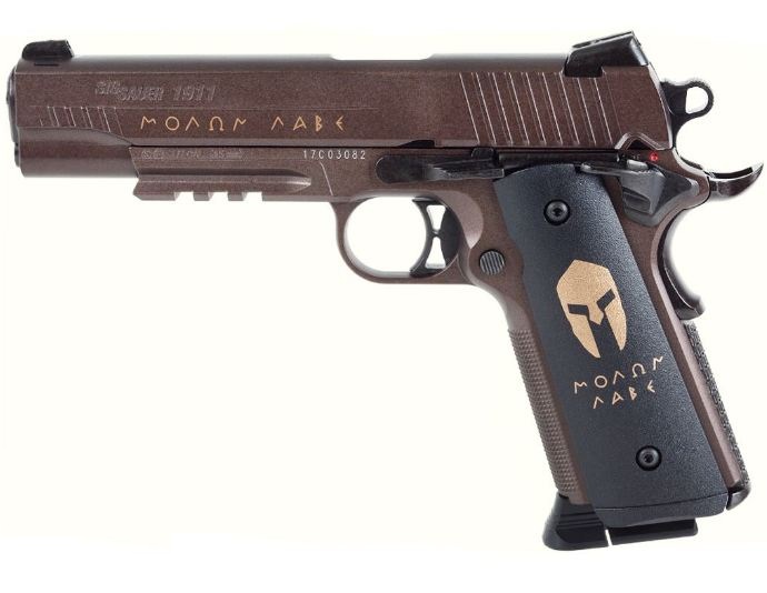 Пневматический пистолет Sig Sauer 1911 Spartan - новинка 2017 года! MOLON LABE, Приди и Возьми. Именно эта фраза легендарного спартанского царя Леонида нанесена на затвор и накладку рукояти пистолета Sig Sauer 1911 Spartan. Цельнометаллический корпус окрашен в цвет бронзы с черными пластиковыми накладками, и это подчеркивает настоящий мужской характер этой модели. Пистолет является репликой боевого оружия производимого кампанией Sig Sauer, который в свою очередь является модификацией американского пистолета Colt 1911, не нуждающегося в представлении. По своим размерам пневматическая версия сохранила основные массо - габаритные показатели. Полная длина соответствует оригиналу и составляет 221 мм. Пневматический пистолет Sig Sauer 1911 Spartan будет интересен всем коллекционерам и любителям высококачественного пневматического оружия, так как он объединяет в себе очень интересный внешний вид, а так же отличное качество сборки. Посмотреть товар в действии можно на видео. Вкладка "видео" выше, справа от вкладки "доставка". Для Екатеринбурга: