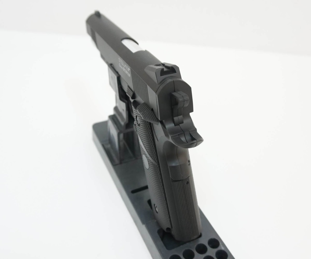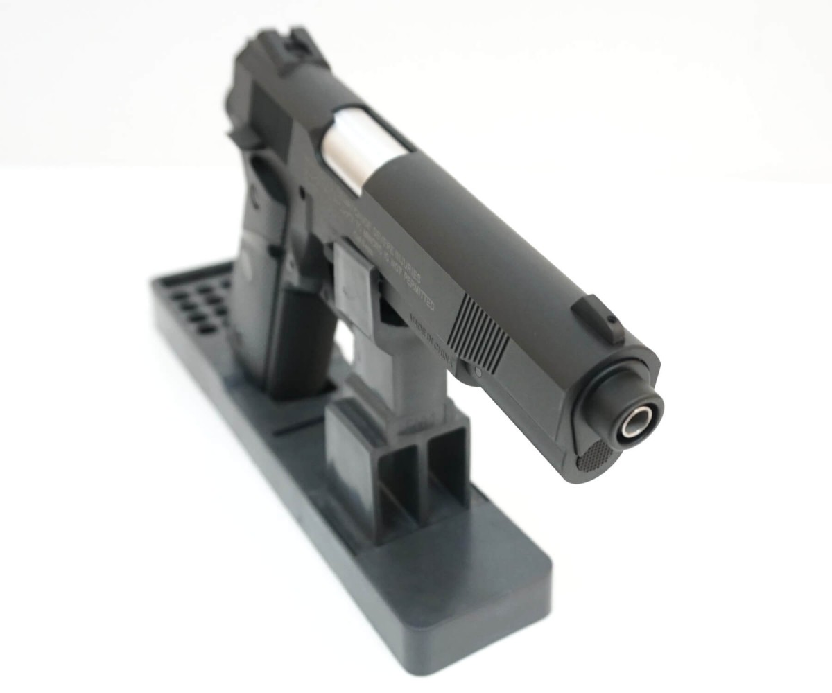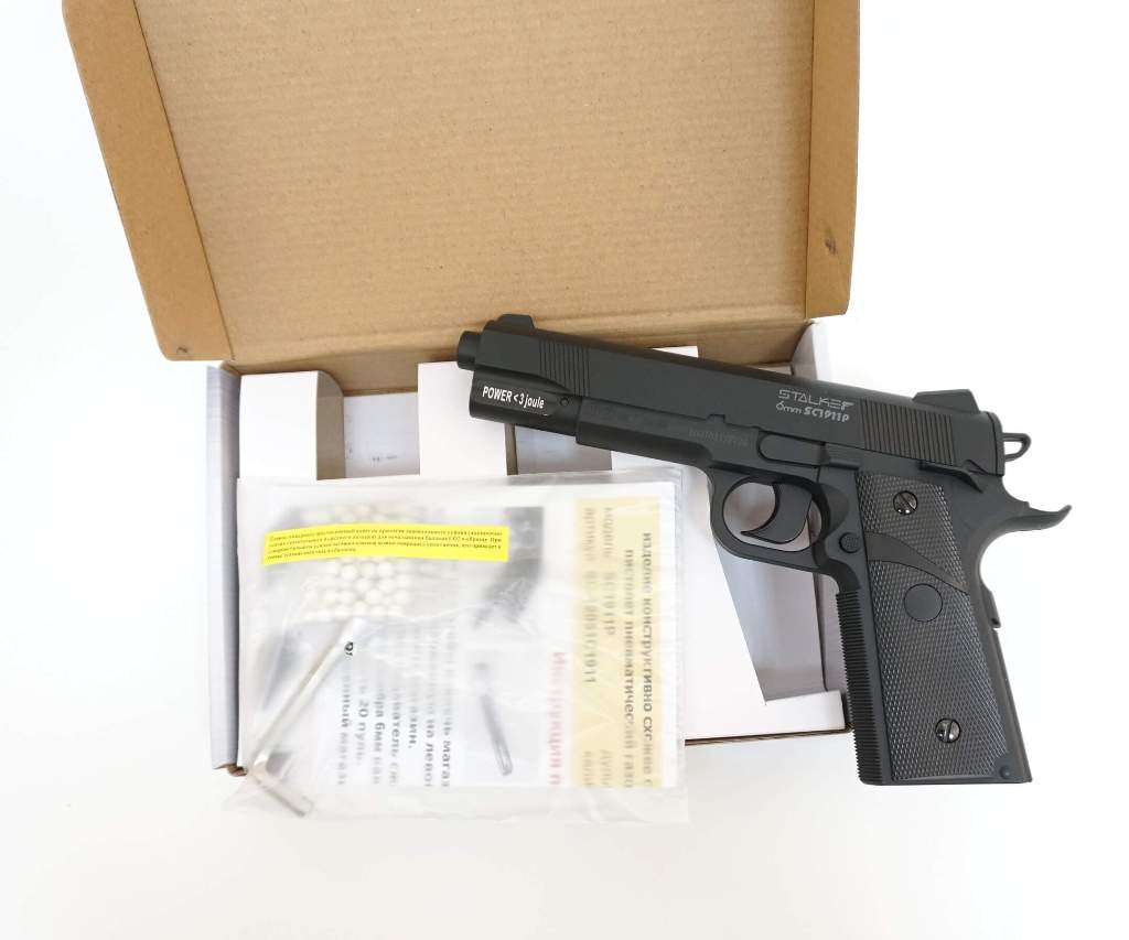 Страйкбольный пистолет Stalker SC1911P (Colt 1911) – это бюджетное решение для начинающих стрелков, недорогая газобаллонная версия Кольт 1911 от азиатского бренда пневматики. В отдельный отсек рукоятки устанавливается газовый баллончик с углекислым газом весом 12 грамм, который является источником энергии этой модели. Магазин на 20 единиц боеприпасов в виде ВВ-шариков 6 мм также расположен в рукоятке. Все магазины этого производителя взаимозаменяемы. Скорость выстрела пистолета Stalker SC1911P составляет 105 м/с. Доступный режим стрельбы – полуавтоматический огонь. В соответствии с российским законодательством модификации с дульной энергией ниже 3 Дж доступны для продажи свободно, без предъявления лицензии и разрешения на оружие. Основной материал изготовления Сталкер С1911П – полимер хорошего качества, обеспечивающий изделию защиту от влаги и небольшой вес. Рукоятка имеет рифленую поверхность для удобства удержания пистолета. В конструкции предусмотрен двухпозиционный предохранитель-тумблер, он находится справа на корпусе. Важно, что ход спускового крючка предохранителем не блокируется. Для начинающих стрелков рекомендуется использовать при стрельбе защитные очки. Весит пистолет всего 0,44 кг, длина 21,5 см. Поставляется в картонной коробке с инструкцией и набором пластиковых шариков. Для Екатеринбурга: