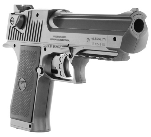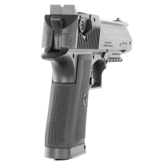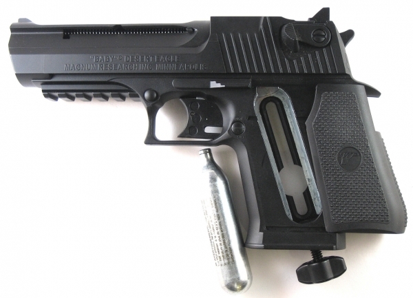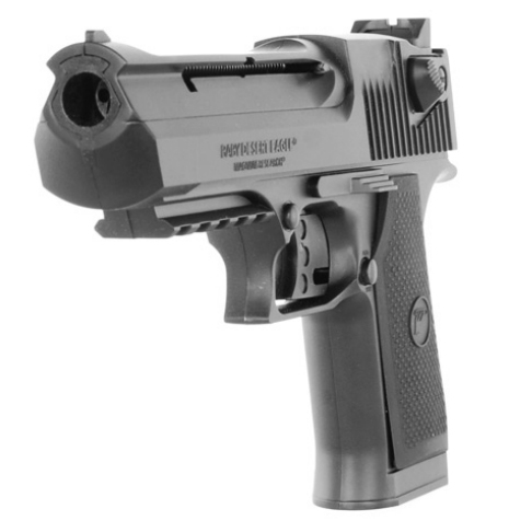 Пневматический пистолет Umarex Baby Desert Eagle – это легкий и удобный пневматический пистолет. Его особенности абсолютно выше его цены, а именно: - схема "подвижного ствола" обеспечивает надежность подачи шариков и минимизирует утечку газа при выстреле за счет отсутствия зазоров при ударе ствола по клапану. Именно за счет этого достигается высокая дульная скорость и большое количество выстрелов с одного баллона - перед спусковой скобой предусмотрено место для установки дополнительных аксессуаров (фонарик, лазерный целеуказатель и т.д.) - для установки баллона накладка рукояти выдвигается "назад" - материал корпуса - пластик, что делает его очень легким (всего 405 грамм) - ствол стальной, гладкий