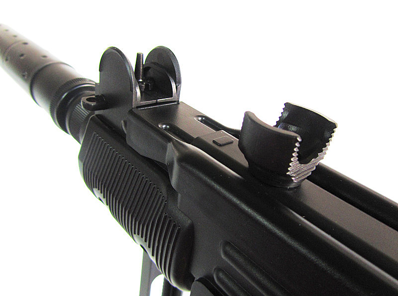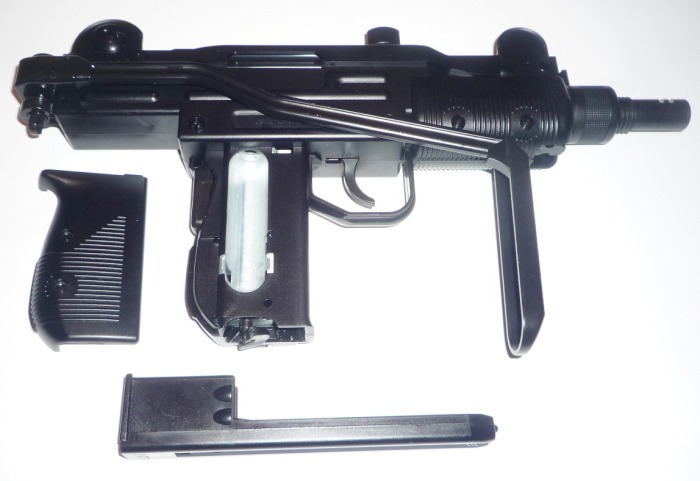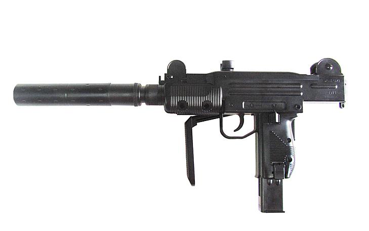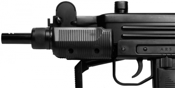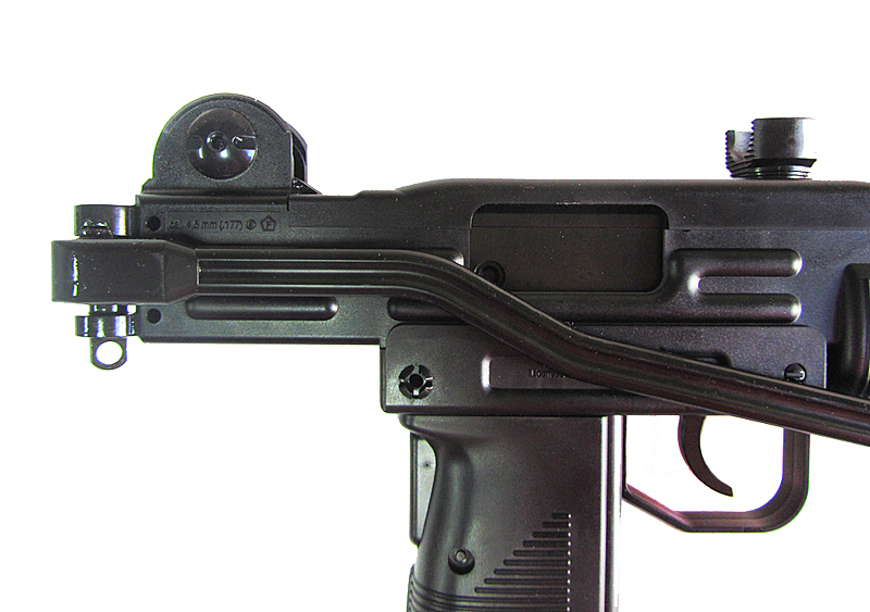Компания Umarex выпустила на рынок пневматическую модель mini UZI. Правда этот вариант пистолета-пулемета не обладает стрельбой очередями, но по внешним данным соответствует своему прототипу. Ручка затвора двигается, открывая при этом шторку справа рамки пистолета-пулемета. Верхняя крышка затвора снимается также как на огнестрельном аналоге. Для этого нужно нажать на защелку, расположенную спереди прицела, а затем снять крышку, потянув ее вверх и назад. При этом можно увидеть внутреннее устройство модели. Корпус модели Umarex mini UZI изготовлен из качественного пластика, а откидной приклад сделан из металла. Поскольку это пневматическое оружие стреляет стальными сферическими пулями, то модель имеет гладкий стальной стволик. Весит пневматический UZI - 1240 грамм. Пистолет-пулемет комплектуется имитатором глушителя, изготовленным из пластика, а также инструкцией на русском языке. Со сложенным прикладом mini UZI имеет длину всего 355 мм. Если разложить приклад, то габариты увеличатся до 594 мм, а с установленным глушителем прибавится еще около 20 см. Приклад не имеет фиксатора, поэтому для его раскладывания и складывания не нужно ничего нажимать. Приклад подпружинен в обоих положениях, поэтому хорошо фиксируется. В передней части оружия имеется небольшое цевье с рифленой поверхностью, для удержания при стрельбе двумя руками. Рукоятка прямая и на первый взгляд довольно крупная, но в руке лежит достаточно комфортно. Пистолет-пулемет имеет два предохранителя - ручной и автоматический. Ручной предохранитель находится с левой стороны, в верхней части рукоятки. В левом положении переключателя, пистолет-пулемет находится на предохранителе, в правом готов к стрельбе. Автоматический переключатель представляет собой клавишу с тыльной части рукояти. Если обхватить рукоятку рукой, то основание ладони нажмет на клавишу, и пистолет будет снять с предохранителя. Если клавиша не нажата, то выстрел произвести не получится. Магазин вмещает 28 стальных шариков. Он извлекается нажатием на прямоугольную кнопку в нижней части рукоятки. Шарики заряжаются примерно также, как в пистолетные магазины, только у UZI обойма более вместительная. Сначала досылатель боеприпасов сдвигается вниз и фиксируется, а затем шарики загружаются в специальное отверстие магазина. Для установки баллончика нужно при снятом магазине отсоединить правую накладку на рукоятку. Тогда в середине рукояти увидим отсек для баллона, а снизу поджимной винт для закрутки баллончика. После установки баллончика, накладка на рукоятку и магазин вставляются на место и модель mini UZI готов к стрельбе. Пистолет-пулемет оборудован диоптрическим прицелом. Перекидной целик имеет два положения с разными диаметрами отверстий, для точной и беглой стрельбы. Пистолет стреляет самовзводом, одиночными выстрелами. Модель оборудована функцией блоубэк. При стрельбе двигается не верхний рычаг затвора, а шторка с правой стороны оружия. Иногда «затвор» двигается очень быстро и почти незаметно для глаз, но при некоторых выстрелах, движение происходит медленнее и заметнее. Точность и мощность пистолета-пулемета Umarex mini UZI достаточна для развлекательной стрельбы на расстоянии 10-15 метров. Для Екатеринбурга: